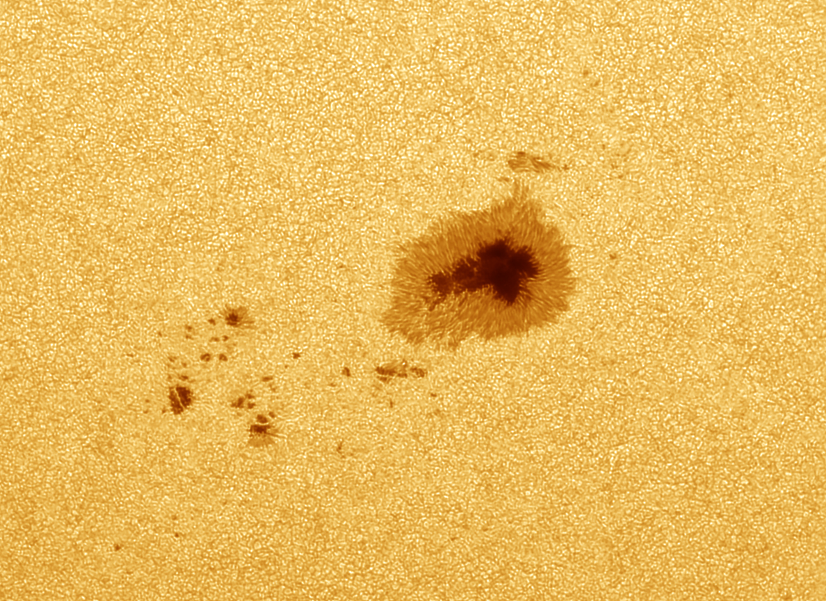 Sunspot Group 3799 from 25.08.2024. Severnoye Tushino, balcony. Telescope LX 85 M6 (D-150 mm, f-1800 mm). Mount EQ-5 OnStep. Aperture filter with AstroSolar solar film. Camera ZWO 290 MM with Player One Photosphere 7.5 nm filter. Exposure - 25 ms, Gain - 175 (29%), stacking 500 out of 2534 frames. Processing in AS, AI 3.0SI, Ps.