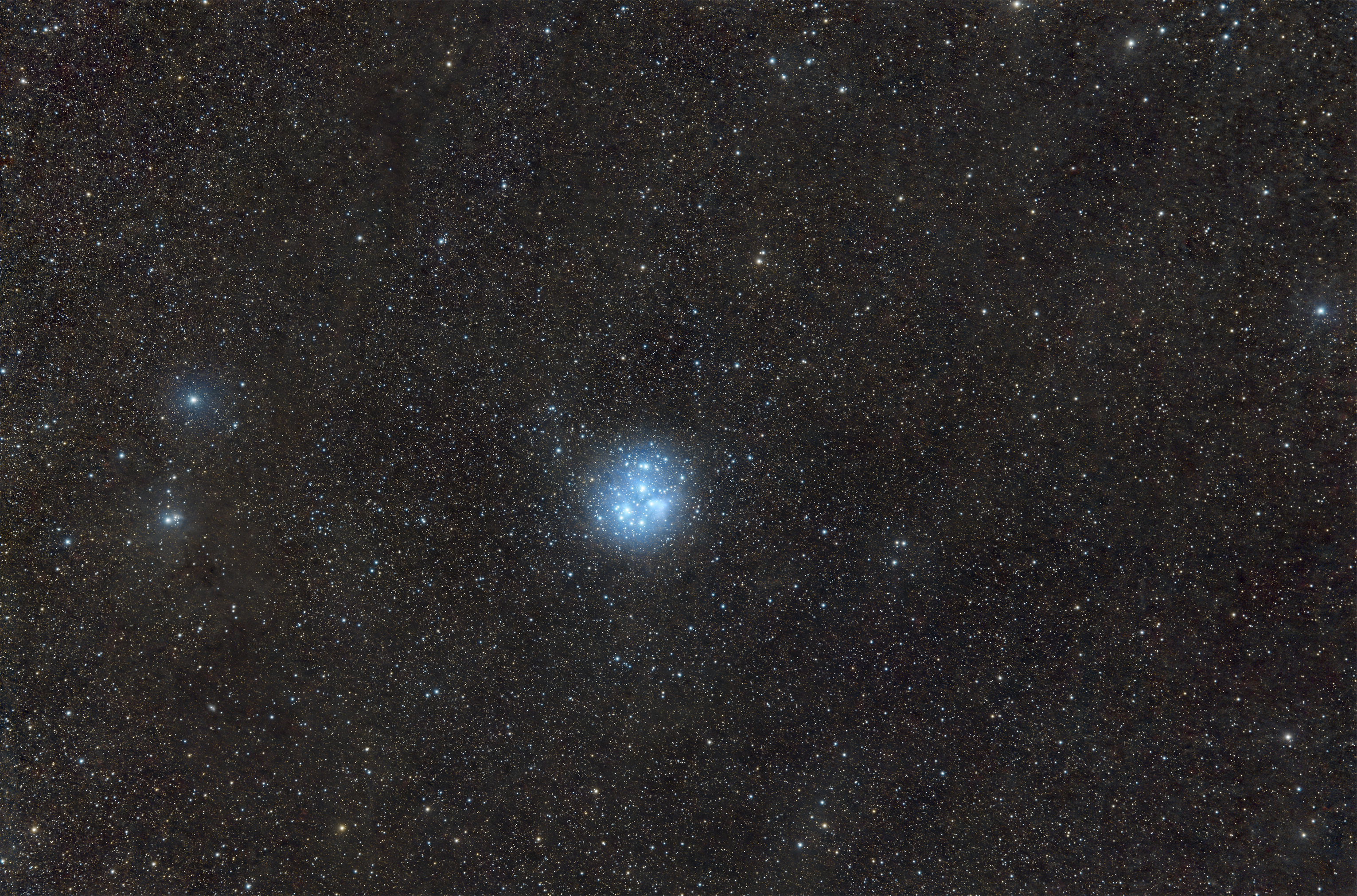 M45 - PLEIADES Telescope/Lens: Canon 18-55 EOS KIT Camera: Canon 700D Mount: Sky Watcher Star Adventurer Software: Siril, GraXpert, PixInsight, BlurXTerminator Russia Light Pollution: Orange zone Exposure: 19 x 120" ISO/Gain: 800 Original size: https://deepskyhosting.com/1BcHQ9W Author: ug0l3k.