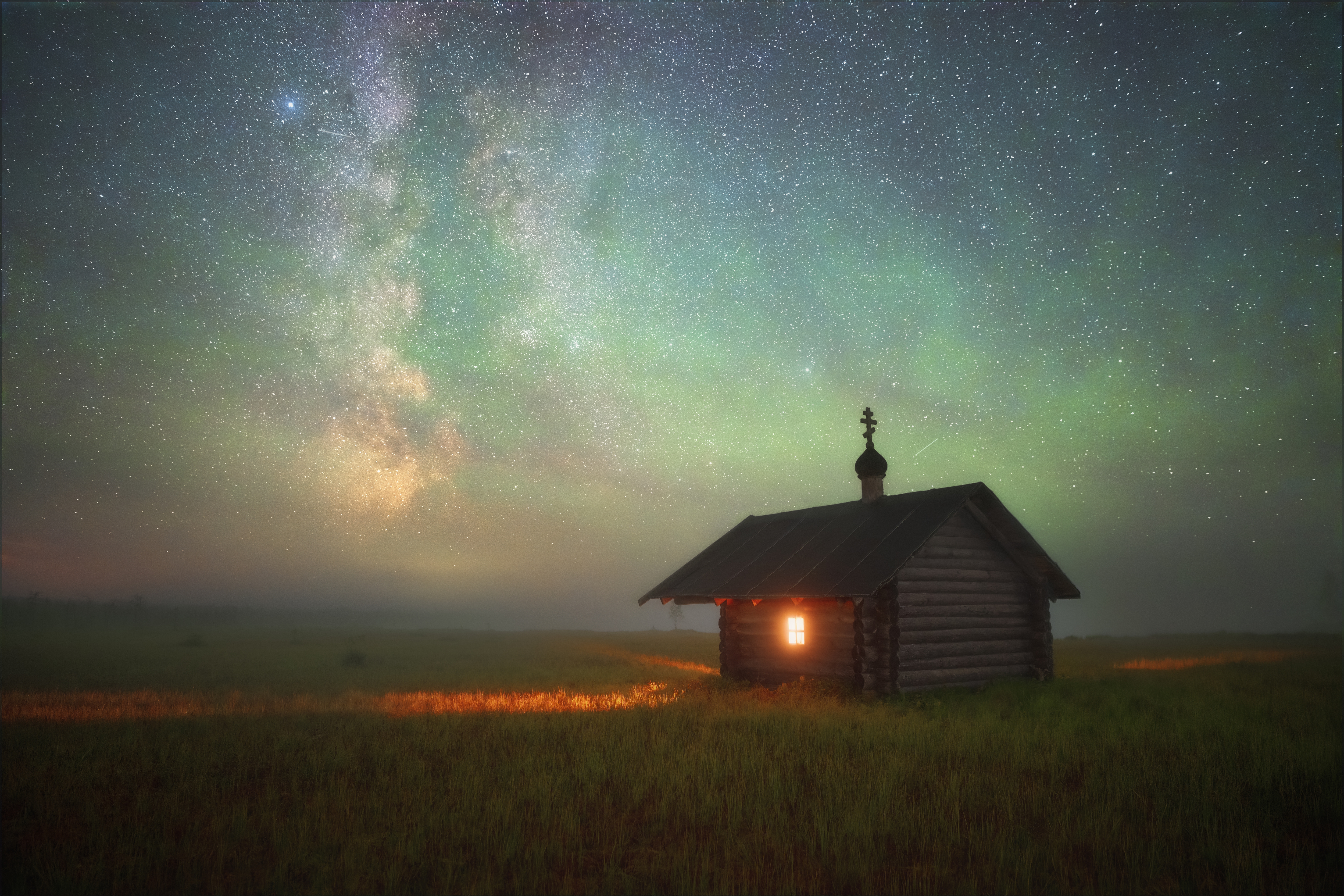 Since last year, a dream had been smoldering within me—to capture in the lens the chapel of John and Jacob of Menuš under the majestic arch of the summer Milky Way. But the universe seemed to laugh at my plans: several attempts were shattered by the whims of the weather. It seemed that fate itself was postponing this shot. And then—a spontaneous night outing that ended in triumph! Luck finally smiled upon us. And not just smiled, but gifted us with unimaginable beauty: besides a scattering of stars, the sky was illuminated by a mysterious atmospheric glow, creating a fantastic backdrop.