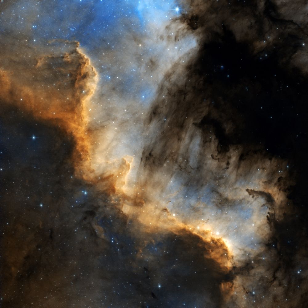 CYGNUS WALL (BICOLOR) Telescope/Lens: Sky-watcher 150PDS Camera: ZWO ASI533MC Pro Mount: Bresser Exos-2 Onstep Guide Scope: Guidescope 50 mm Guide Camera: ZWO 120-MM Software: Siril, StarNet, Photoshop Accessories: Baader MPCC Mark III Rudensk, Russia Light Pollution: Orange zone Exposure: 51 x 300" ISO/Gain: 100 - Svbony SV220 Dual-Band 7 nm Tried stacking in Siril using the Hubble palette. Looks pretty good. Original size: https://deepskyhosting.com/3TQRvPp Author: Dovnar Ivan