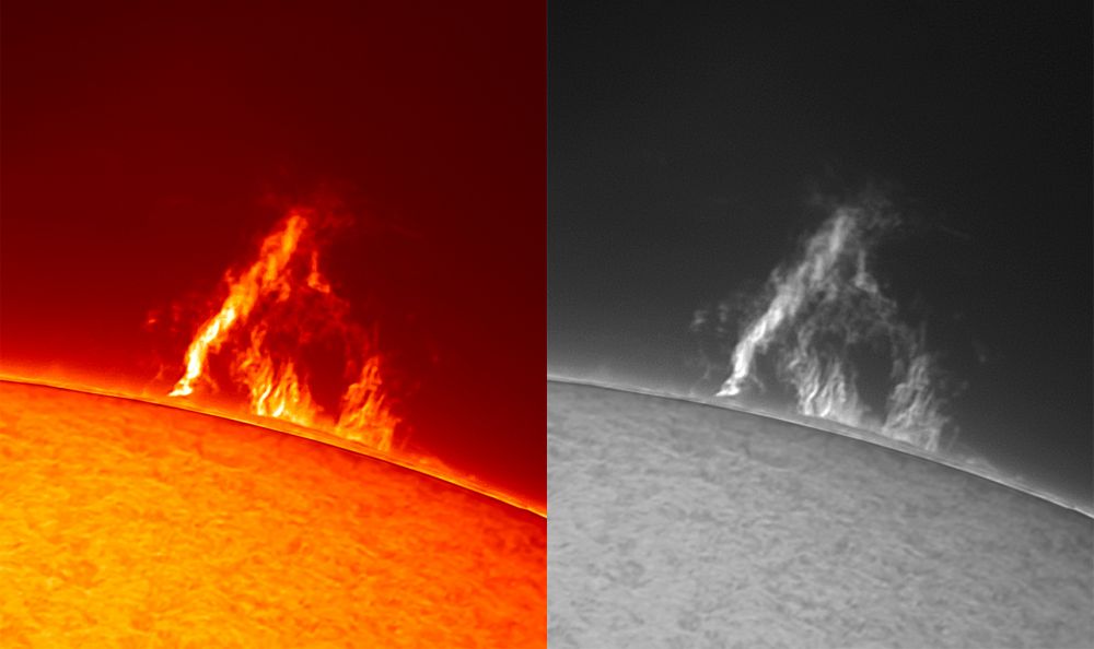 Collage of two frames with different exposures (for the surface and the prominence separately) in each 1000 frames, 20% in the stack.