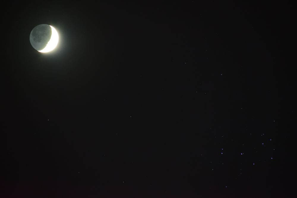 Earthshine and the Pleiades, March 23, 2026