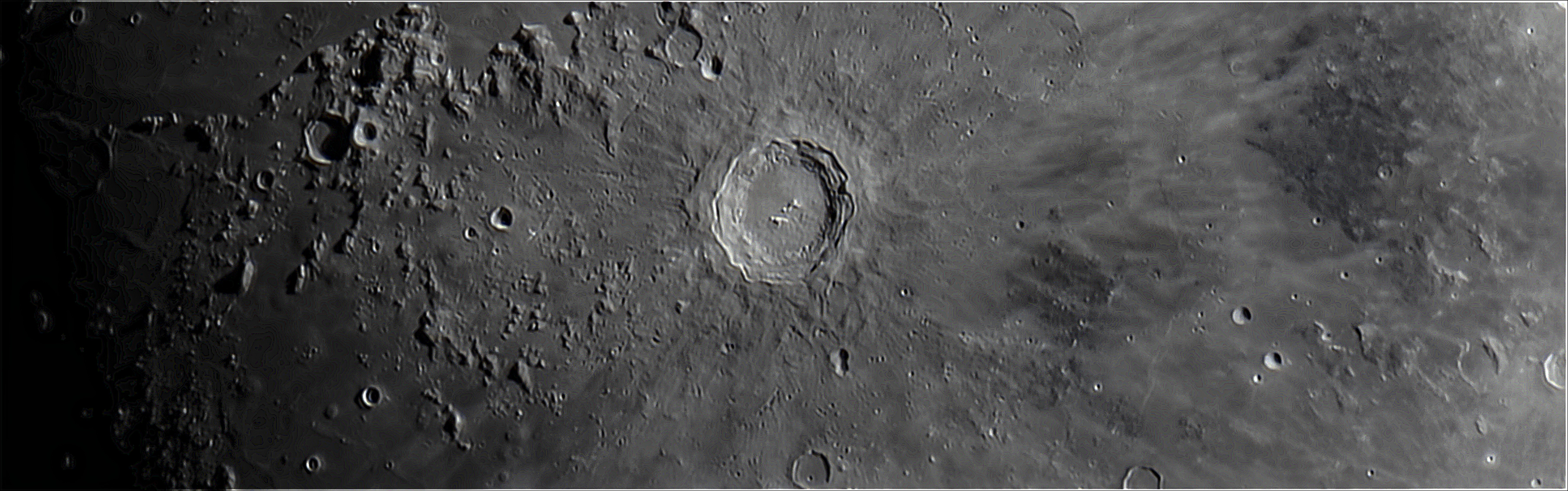 A panorama of four frames. Each video consists of 4500 frames, with 15% used in the stacking, haze present.