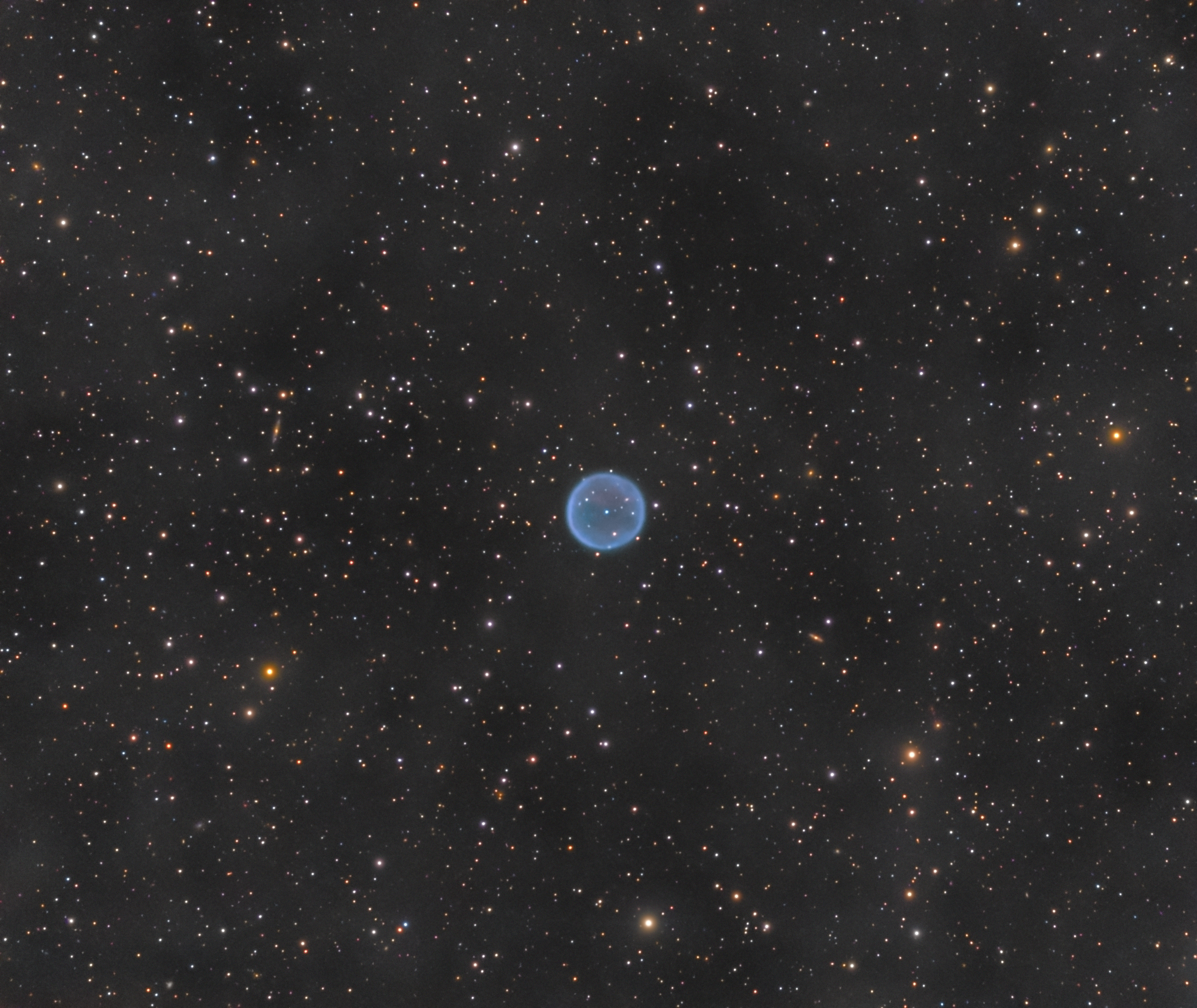 Abell 39 was discovered by George Abell in 1966. The nebula has a diameter of about five light-years, and the thickness of the spherical shell is about a third of a light-year. The nebula itself is roughly 7,000 light-years from Earth.