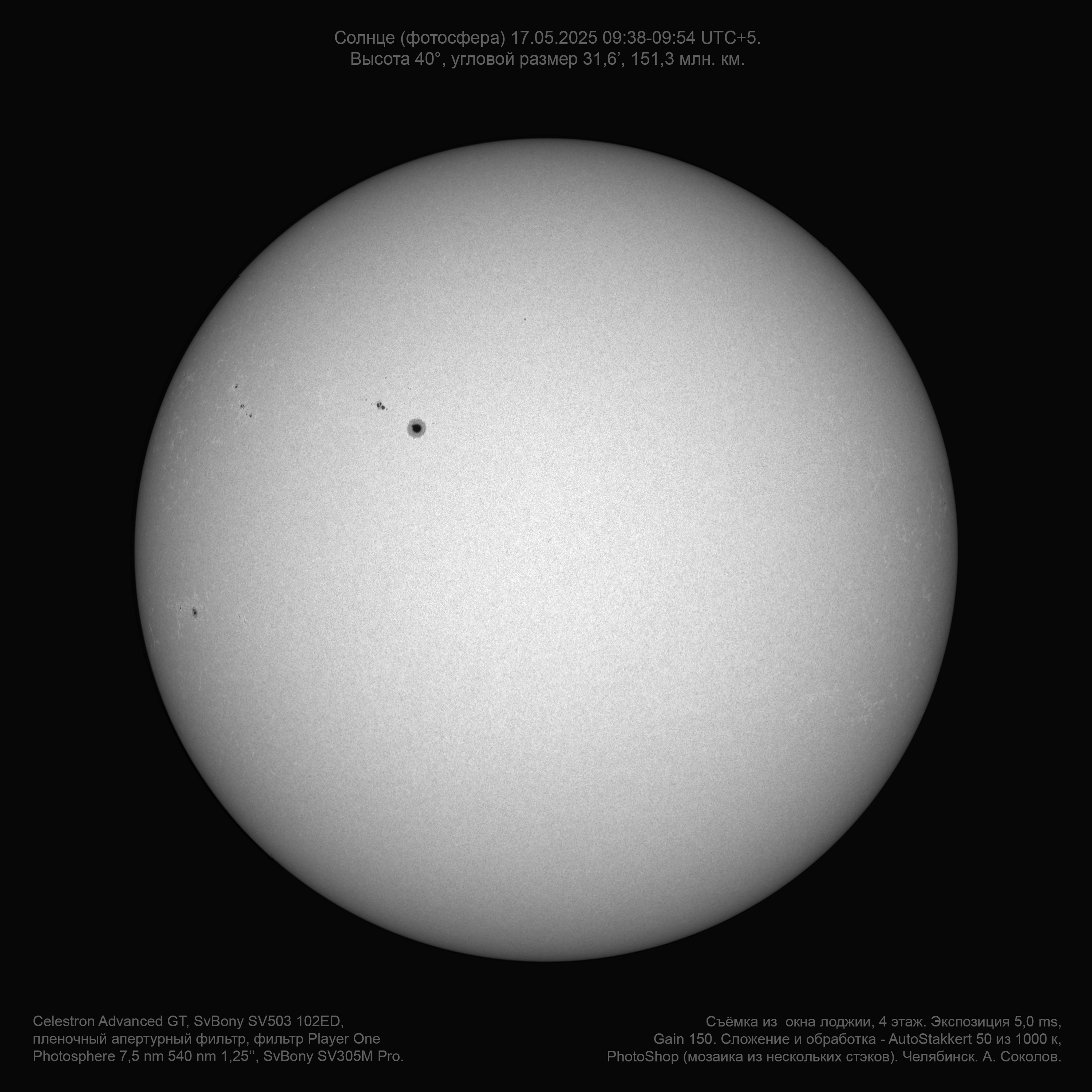Sun 09:38-09:54 UTC+5 17.05.2025. Chelyabinsk, 4th floor loggia. Celestron Advanced GT, SvBony SV503 102ED, film aperture filter, Player One Photosphere 7.5 nm 540 nm, SvBony SV305M Pro. SharpCap 5 ms gain 150. AutoStakkert 50 out of 1000 k, Photoshop (mosaic).