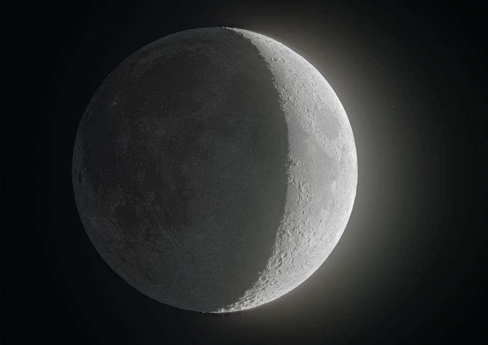 Another shot of the Moon's earthshine at a relatively large phase. For the HDR composite, the Moon was captured with 6 exposures at 1.5-stop intervals; for the minimum exposure, 200 out of 2000 frames were stacked, for the others, 50 out of 200, with manual HDR assembly in PS.