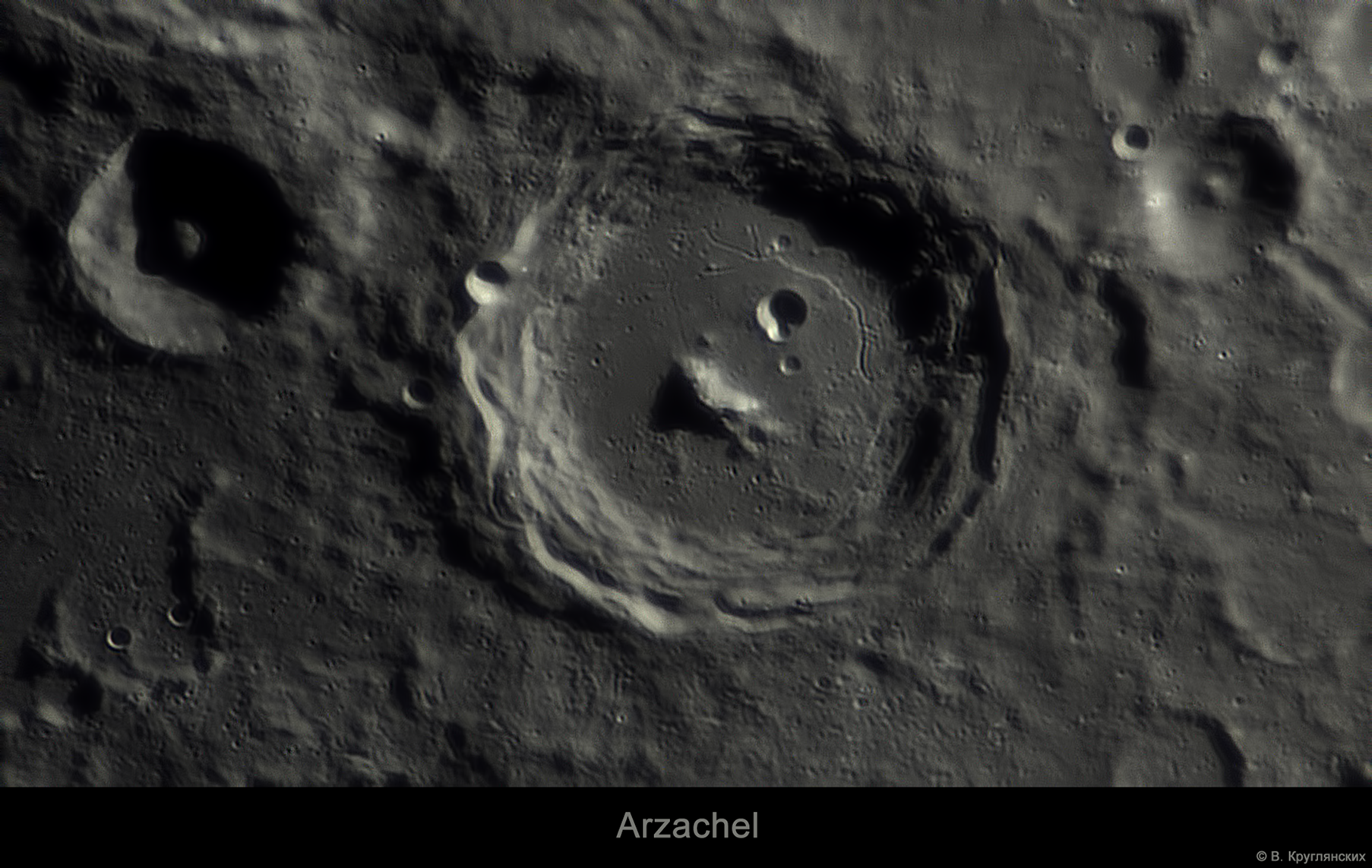 Crater Arzachel. A relatively young impact crater located in the central southern part of the Moon.