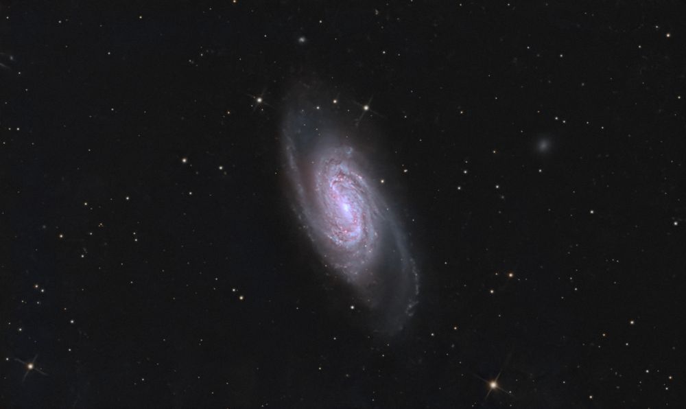 Let's say not a frequent guest on our astro-hosting, shot at the end of March 29-30.03. NGC 2903 is a nearby isolated barred spiral galaxy located in the constellation Leo. It was discovered by William Herschel on November 16, 1784. It exhibits a high star formation rate in the circumnuclear region. The star formation rate within a radius of 650 pc around the center is estimated at 0.7 M⊙ per year. In this region, numerous massive young star clusters immersed in clouds of ionized hydrogen (HII) are observed in the visible and near-infrared ranges; bright emission is also evident in the ultraviolet and X-ray ranges. The star-forming regions in the center are fueled by a flow of interstellar gas along the central bar, extending 1′ (about 2.5 kpc) from the center. The rate of gas inflow into the galaxy's center is comparable to the aforementioned star formation rate, 0.7 M⊙ per year.