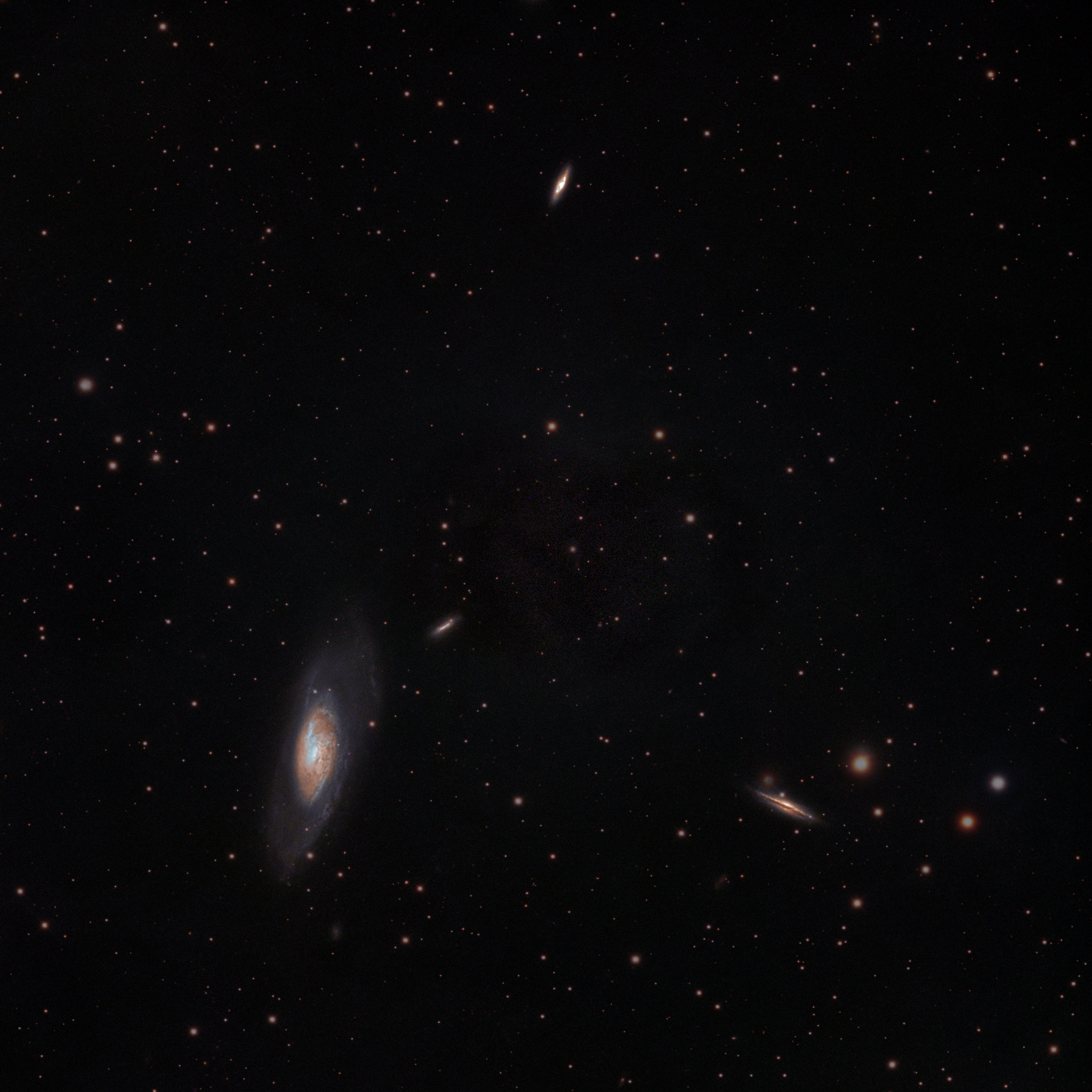 I decided to capture M106 along with the surrounding galaxies. In addition to the neighboring NGC 4248, the frame also includes NGC 4220 (above) and NGC 4217 (below), next to which the faint NGC 4226 can be seen. It’s been a very long time since I last sat down to process photos, especially LRGB imaging, so it didn’t come out without flaws. I’ll need to redo it later, but for now, I can’t manage anything more. The imaging took place over 3 nights in March — the 15th, 23rd, and 24th.