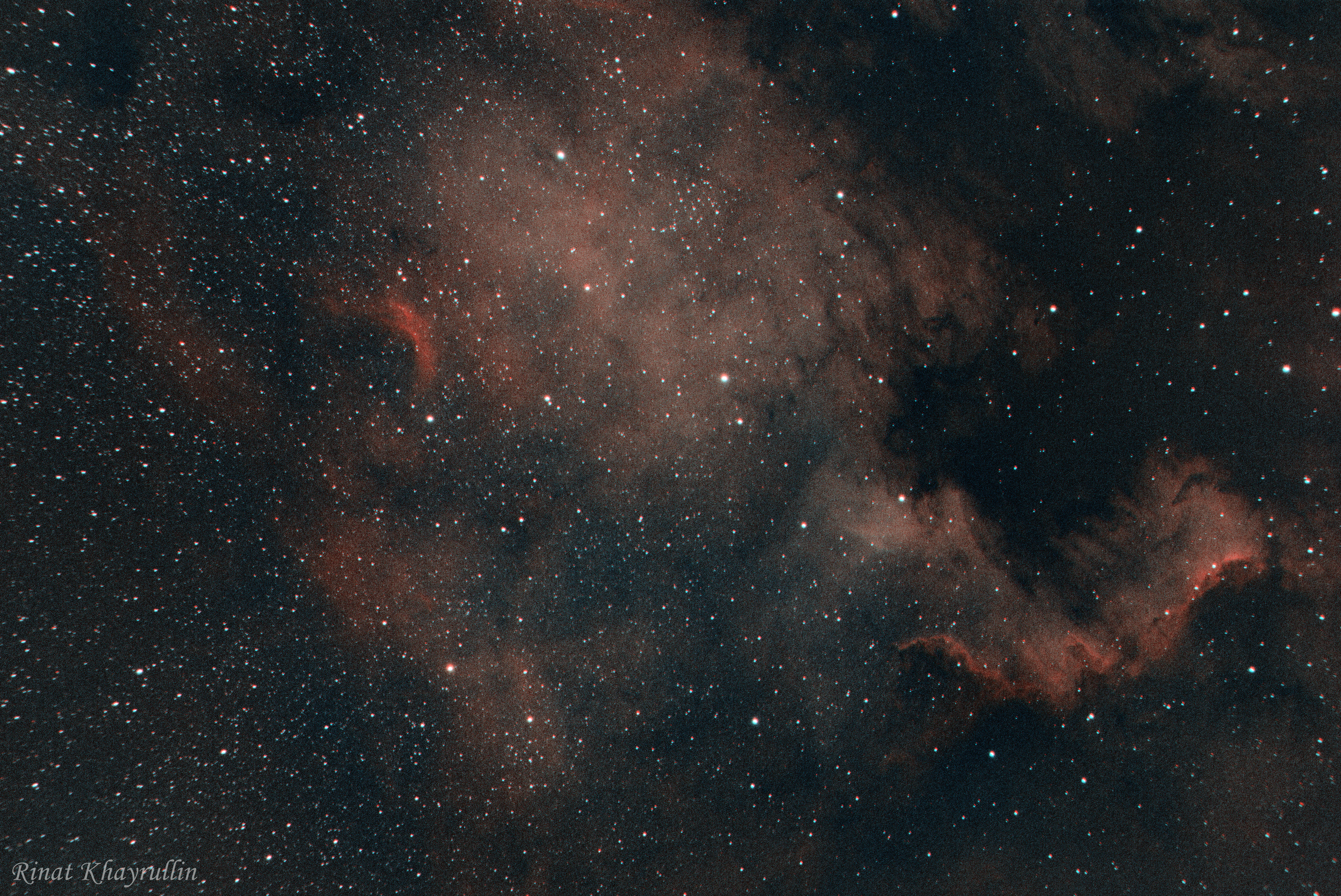 The shooting was done from the balcony. The outside air temperature was -18°C, camera cooling -20°C. I was doing the first test shoot with this setup. So I didn't bother, in general, no darks, no flats, and no biases. Filters are narrowband SVBONY Ha, OIII, SII 5nm. I re-stacked several times in Siril, in the end, I only used combinations of Ha and OIII.