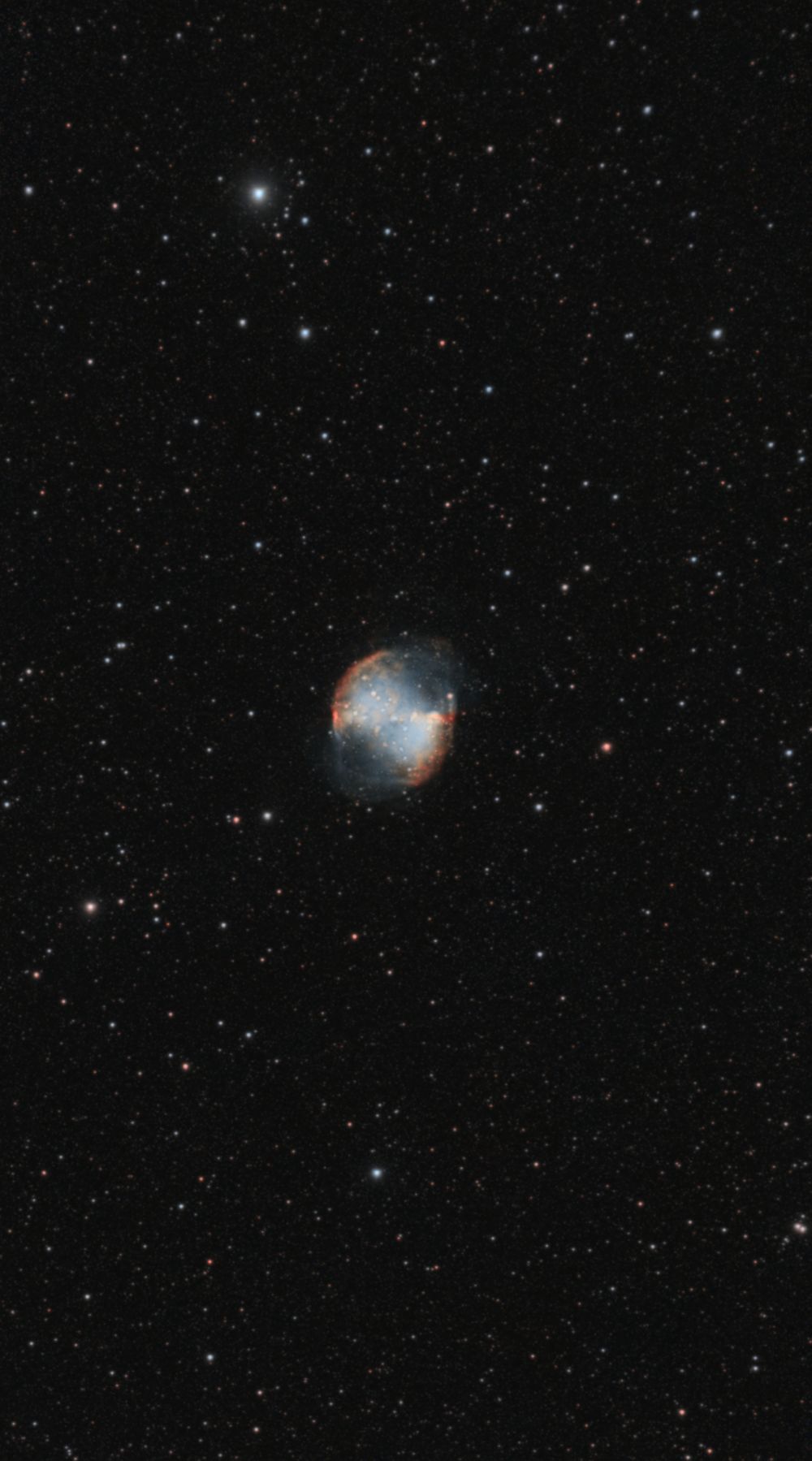 M27 - DUMBBELL NEBULA Telescope/Lens: ZWO SeeStar S50 Camera: IMX462 Software: Siril, GraXpert, Seti Astro Suite Smolensk, Russia Light Pollution: Blue zone Exposure: 311 x 10" ISO/Gain: 80 - Duo-band Original size: https://deepskyhosting.com/KwfMviu Author: Dandscope