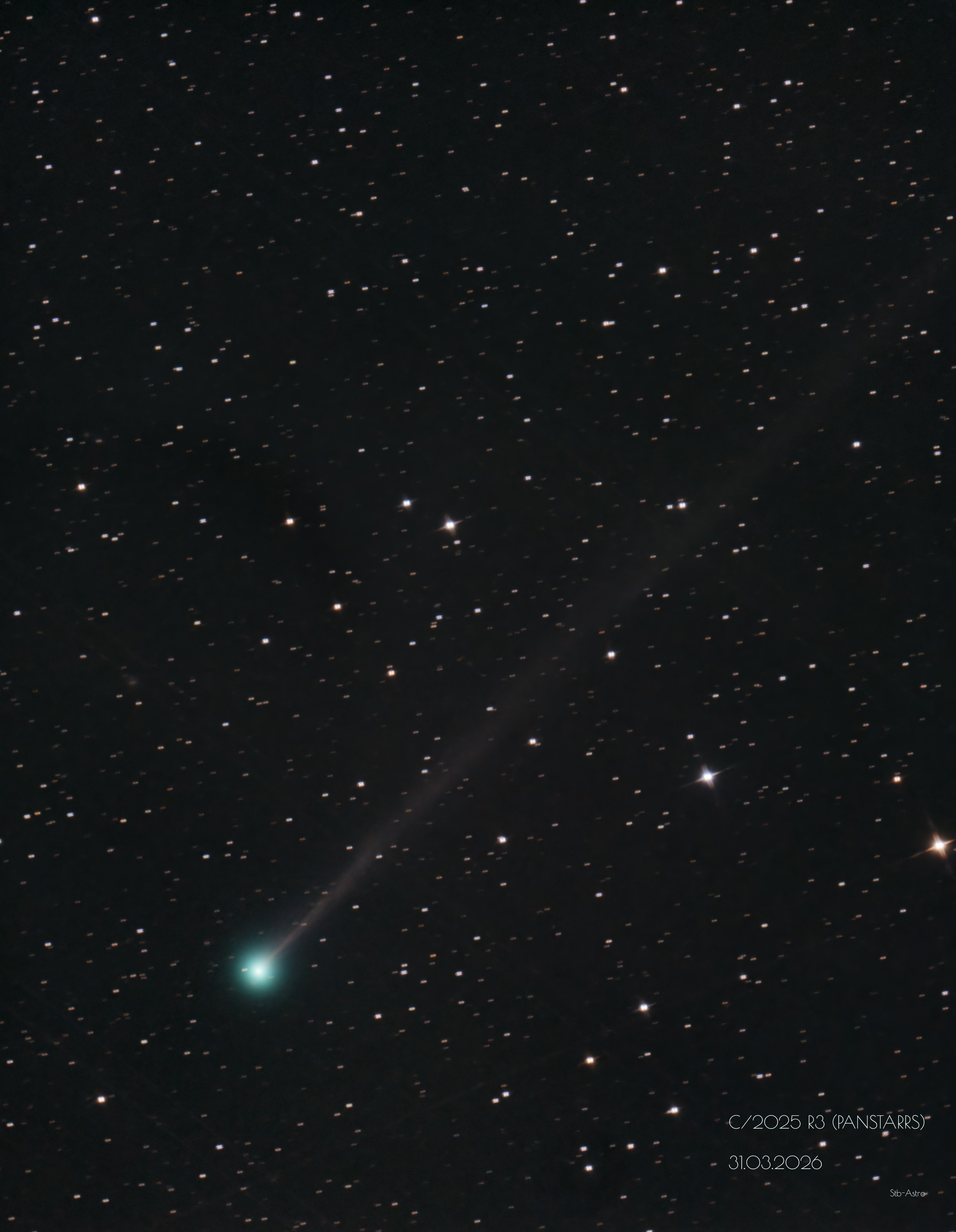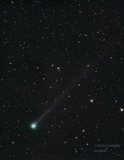 The comet's altitude above the horizon at the time of capture was less than 14 degrees. There was high-altitude cloud cover, haze near the horizon, plus the Moon had not yet set (phase +0.94). I planned to take 10 one-minute exposures, but one of the original frames had to be discarded during stacking in DSS.