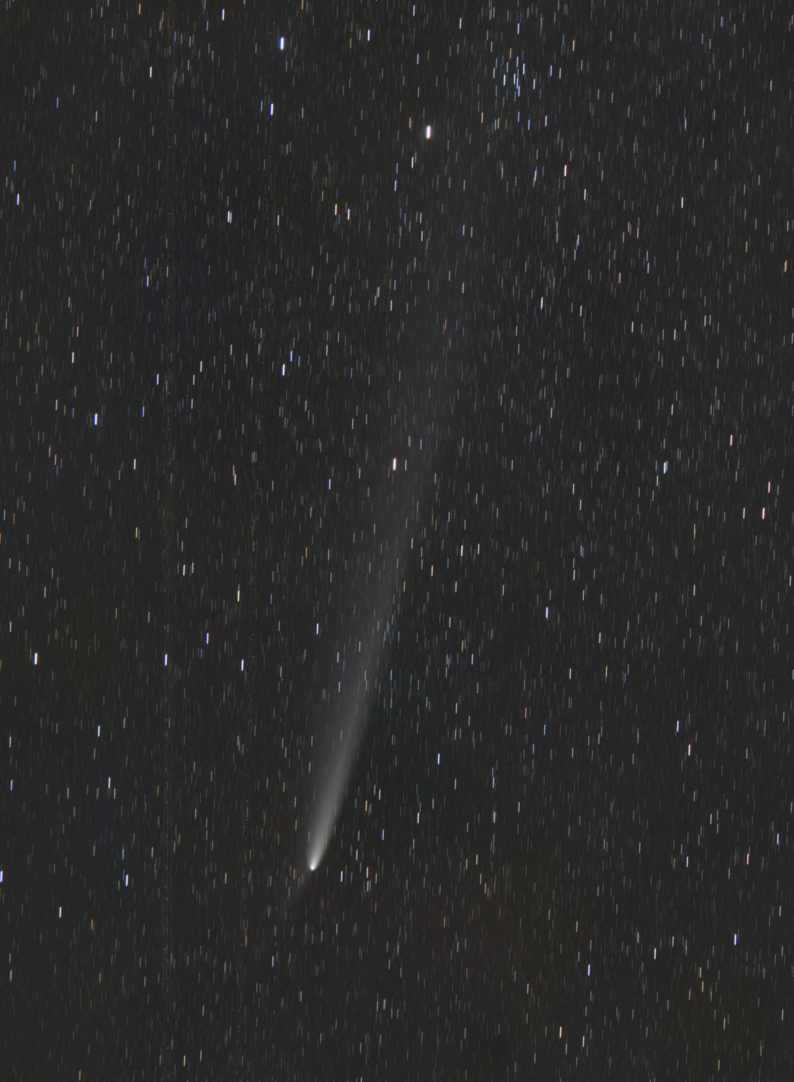 Finally managed to observe the comet. It was very well visible to the naked eye and even its tail was visible, despite the fact that it has long since passed its maximum brightness. I specifically went to the observatory for it. Unfortunately, the wires got in the way and I had to crop the sides. I used a mount as an astrotracker.