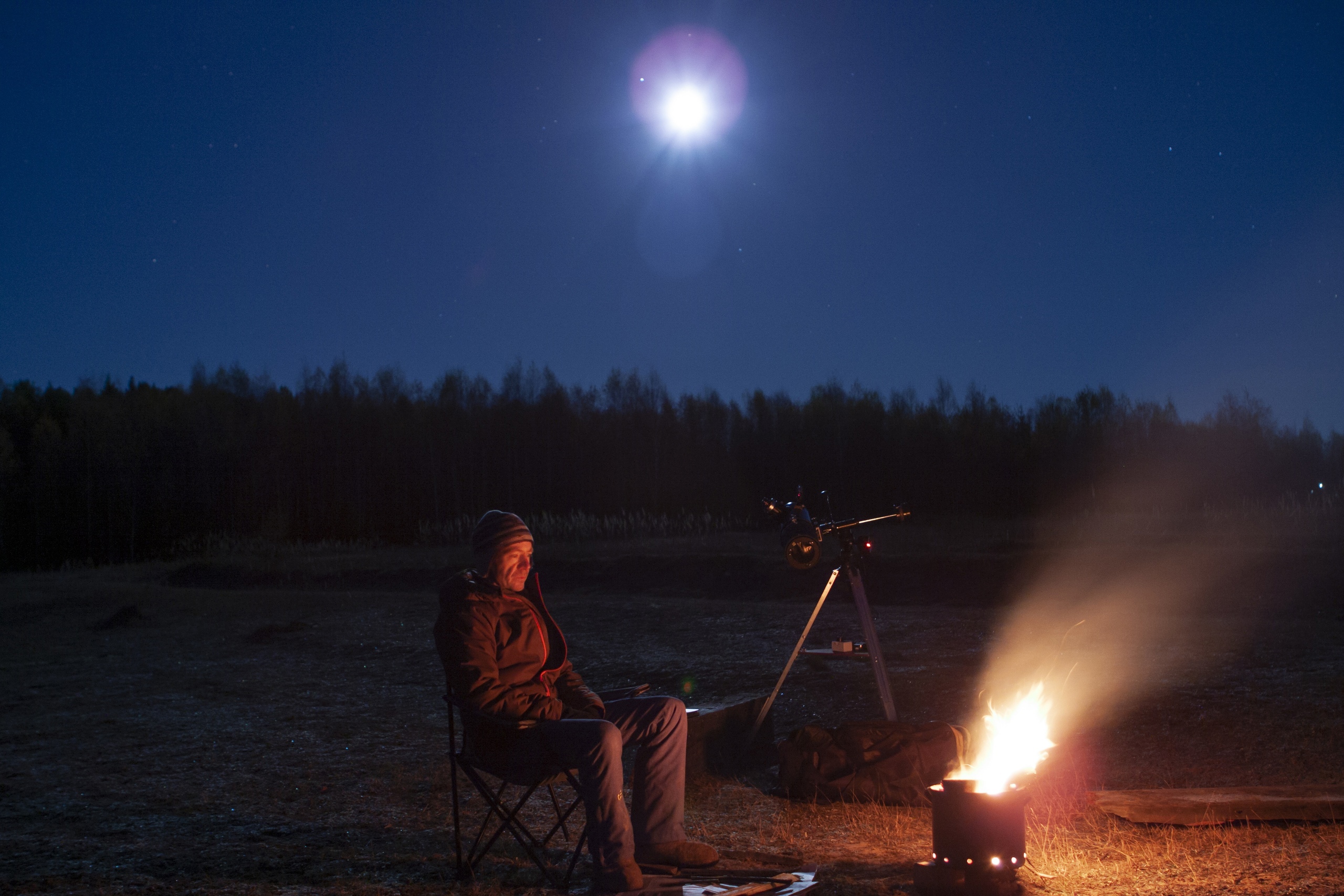 I am by the campfire against the backdrop of the moon