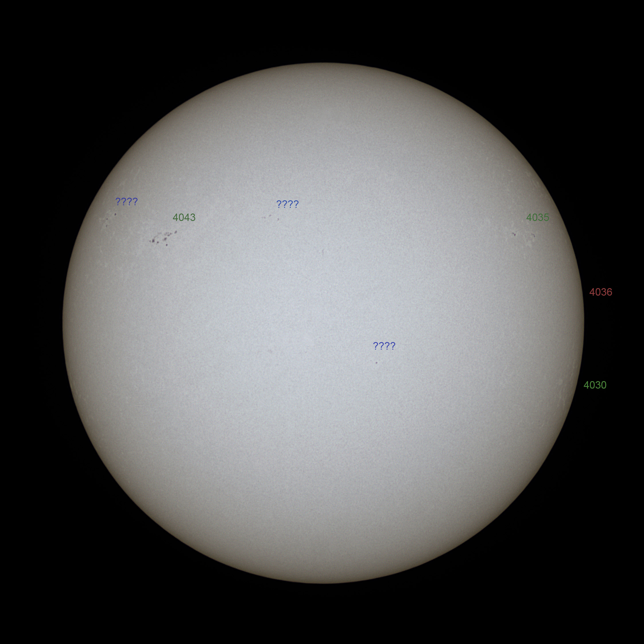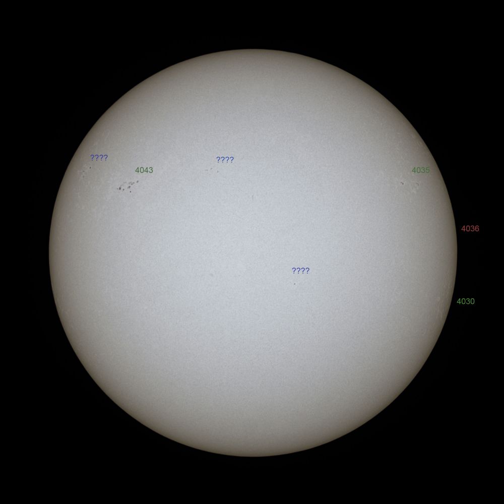 Sun 27.03.2025 09:55 UTC+5. Height 26°. Balcony window 4th floor. Chelyabinsk. Svbony SV225 (AZ), SvBony SV503 102ED, film aperture filter, SvBony UV/IR-cut 2", Nikon D5000 1/4000 ISO200. AutoStakkert - 10/30 frames (Drizzle x1.5), Photoshop. Interesting moment - on the websites Xras.ru and Spaceweatherlive.com the numbering of sunspot groups does not correspond to their actual presence (photo 2). Three new groups don't have numbers, and numbers of already invisible groups are present. Although it's stated that information is updated every hour, and more than 2.5 hours have passed from shooting to publishing this message. Something is "rotten in the state of Denmark"?)