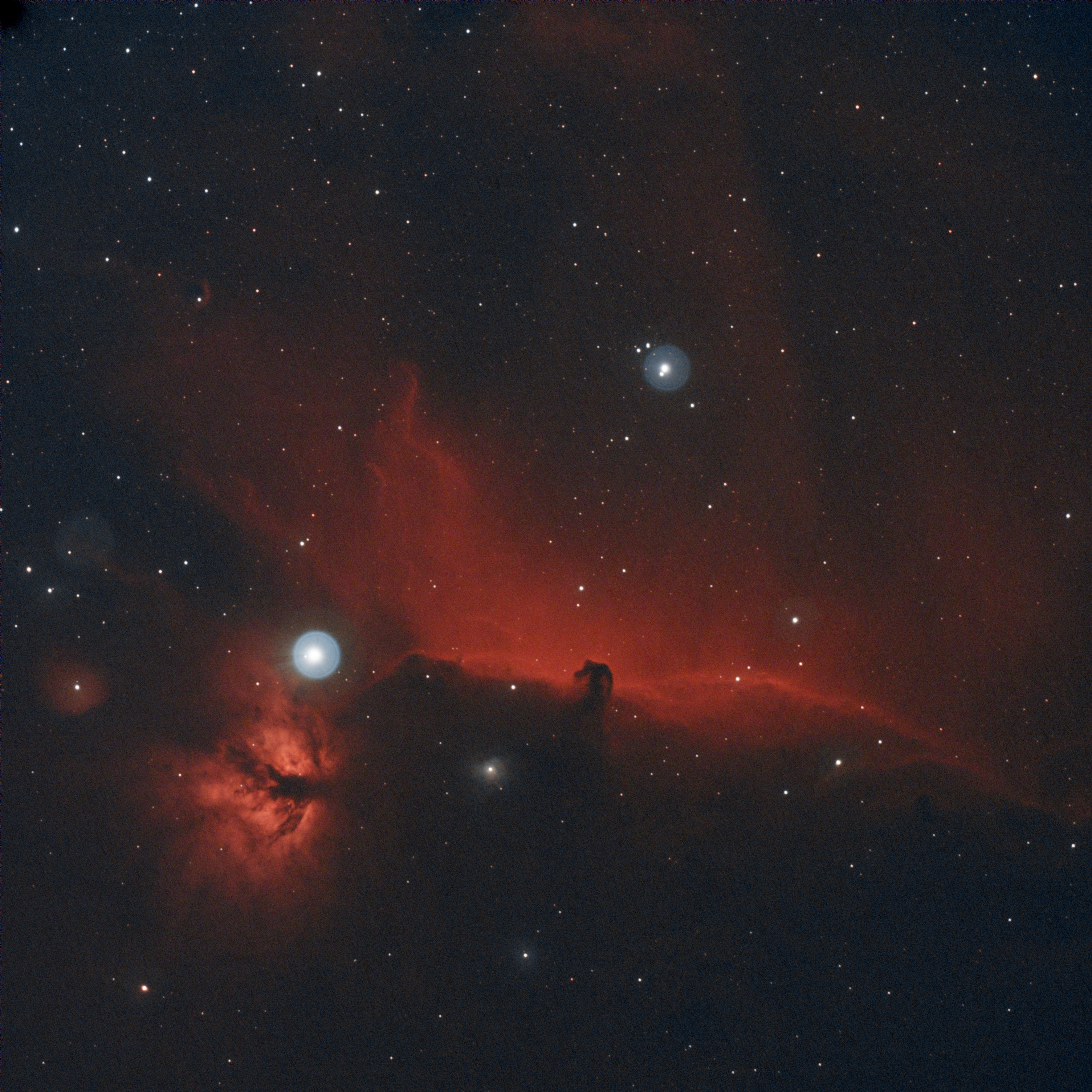 The "Flame" and "Horsehead" nebulae (IC434) in Orion, as seen through a dual-band filter.