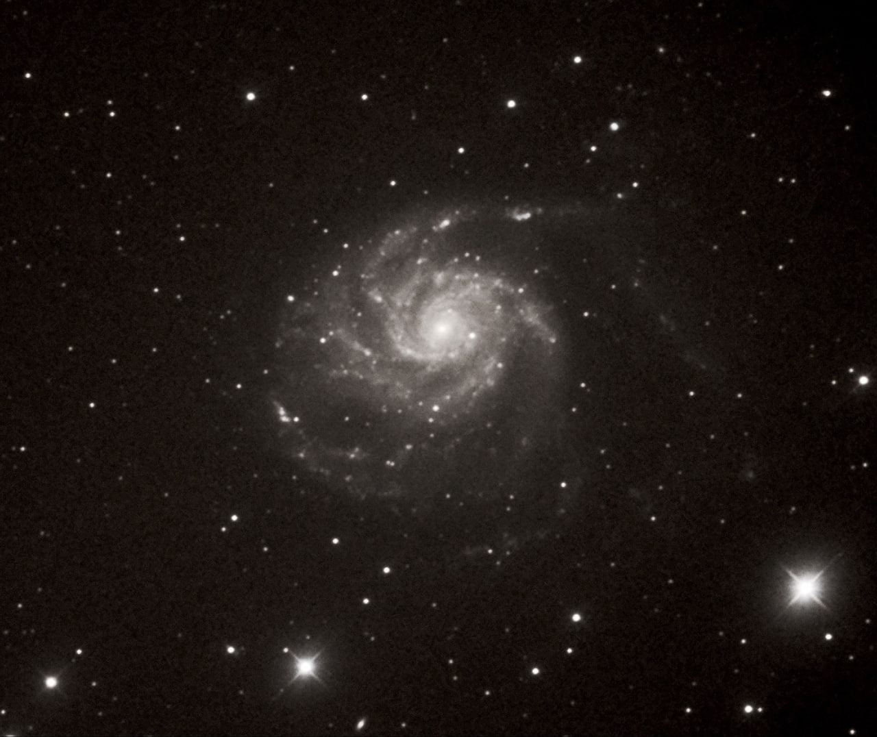 We see M101 face-on; it is very similar to our Milky Way, only somewhat larger in size. The galaxy has well-defined spiral arms and a small, compact bulge (a spheroidal concentration of stars at the galaxy's center).
