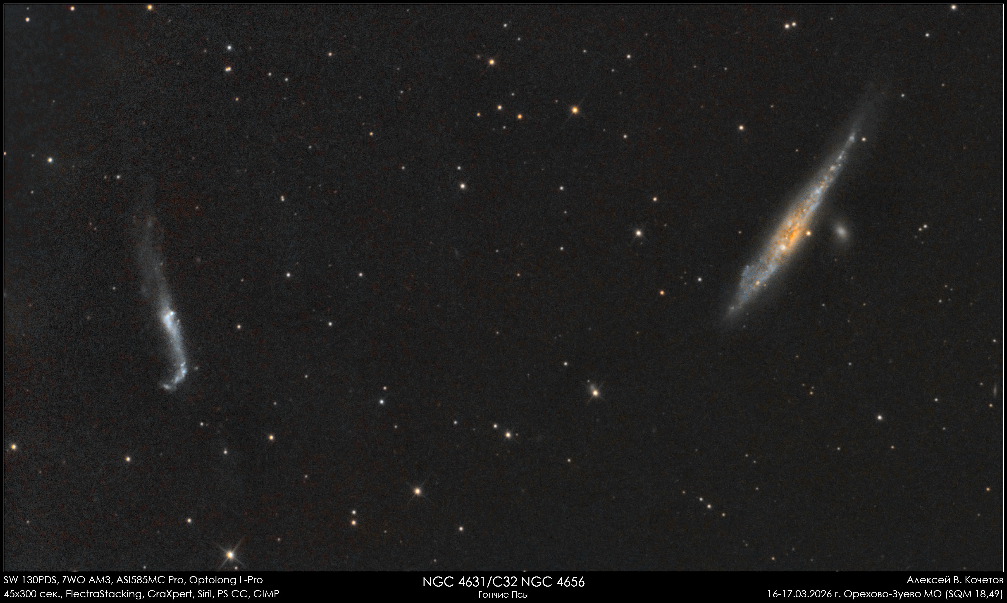 Through a 254 mm aperture telescope (green zone, SQM 20.86), the edge-on galaxy NGC 4631 appears as a long, thick nebulous band in which individual stars can be discerned, with a noticeable thickening and increase in brightness at one edge. With averted vision, some non-uniformity in the nebula is noticeable. Nearby lies another spiral galaxy, NGC 4656 (The Hockey Stick), also seen edge-on but significantly fainter, appearing as a ghostly, thin nebulous strip without any details, with a barely noticeable brightening at one end. Both galaxies are visible in the same field of view of a 24 mm eyepiece.