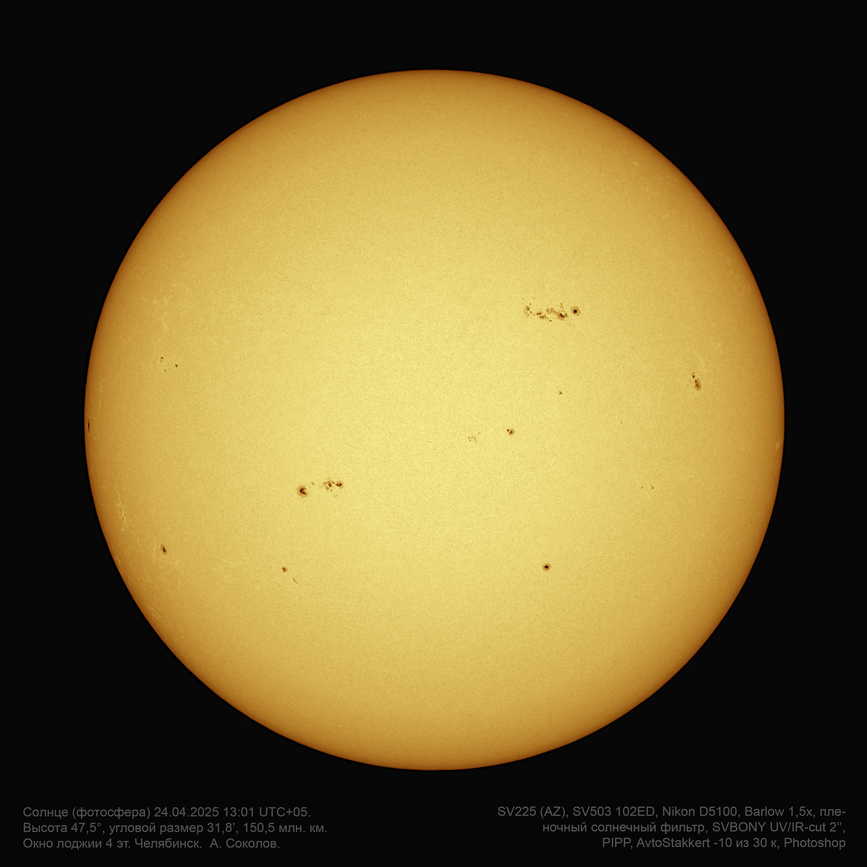 Sun (photosphere) 24.04.2025 13:01 UTC+05. Altitude 47.5°, angular size 31.8', distance 150.5 million km. Loggia window 4th floor SVBONY SV225 (AZ), SVBONY SV503 102ED, Nikon D5100, lens block from Barlow 3x, film filter, 2" filter SvBONY 2" UV/IR-cut. Exp=1/1000 s, ISO 200. PIPP, AutoStakkert 10/30 k, Photoshop.
