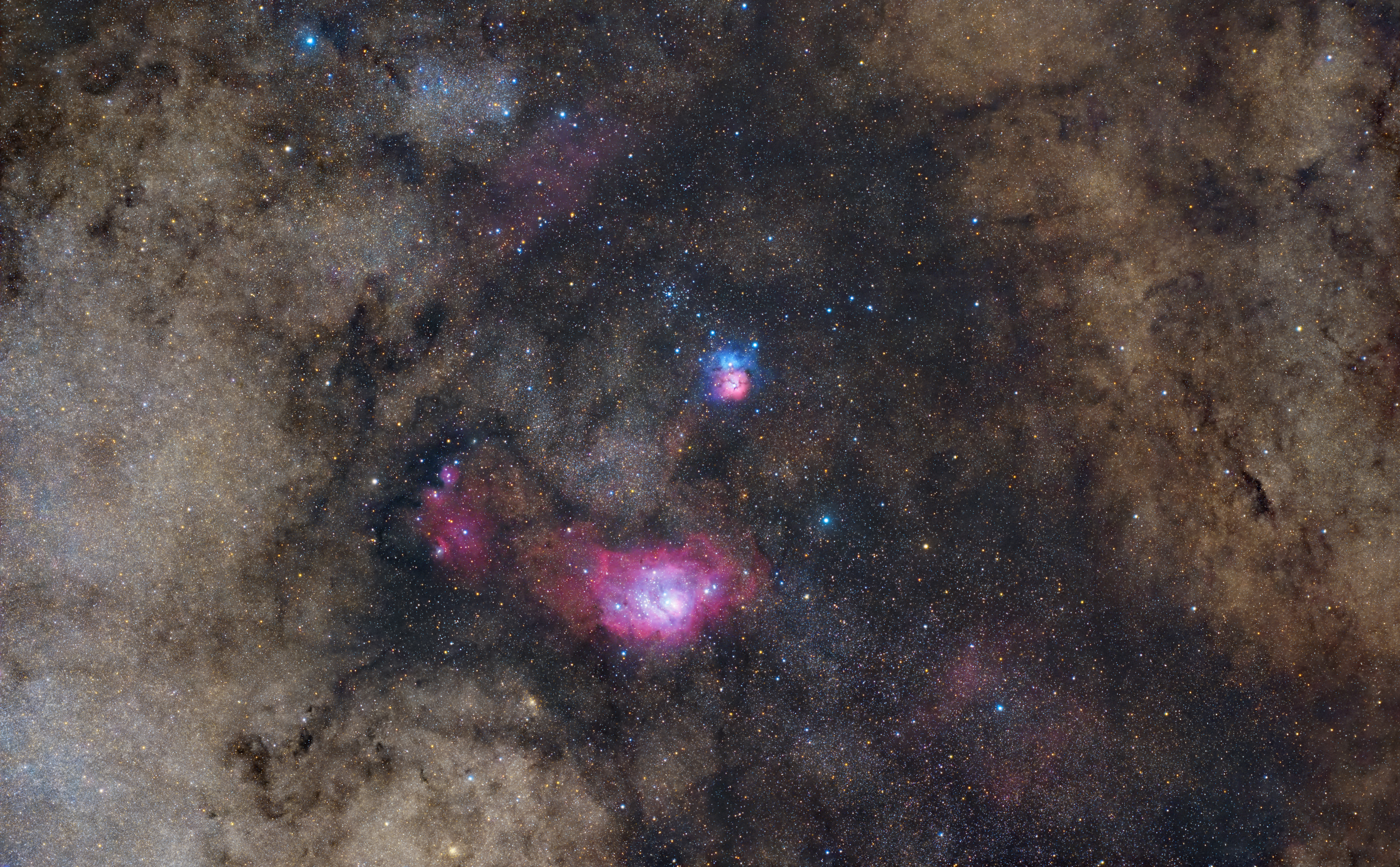 LAGOON AND TRIFID (M8, M20) Telescope/Lens: Юпитер-37а 135mm Camera: Canon 550da Mount: Астротрекер АТ 1 Software: DSS, PixInSight, Photoshop Pyatigorsk, Russia Light Pollution: Orange zone Exposure: 304 x 40" ISO/Gain: 800 Original size: https://deepskyhosting.com/S7H4aMO Author: Aleksandr