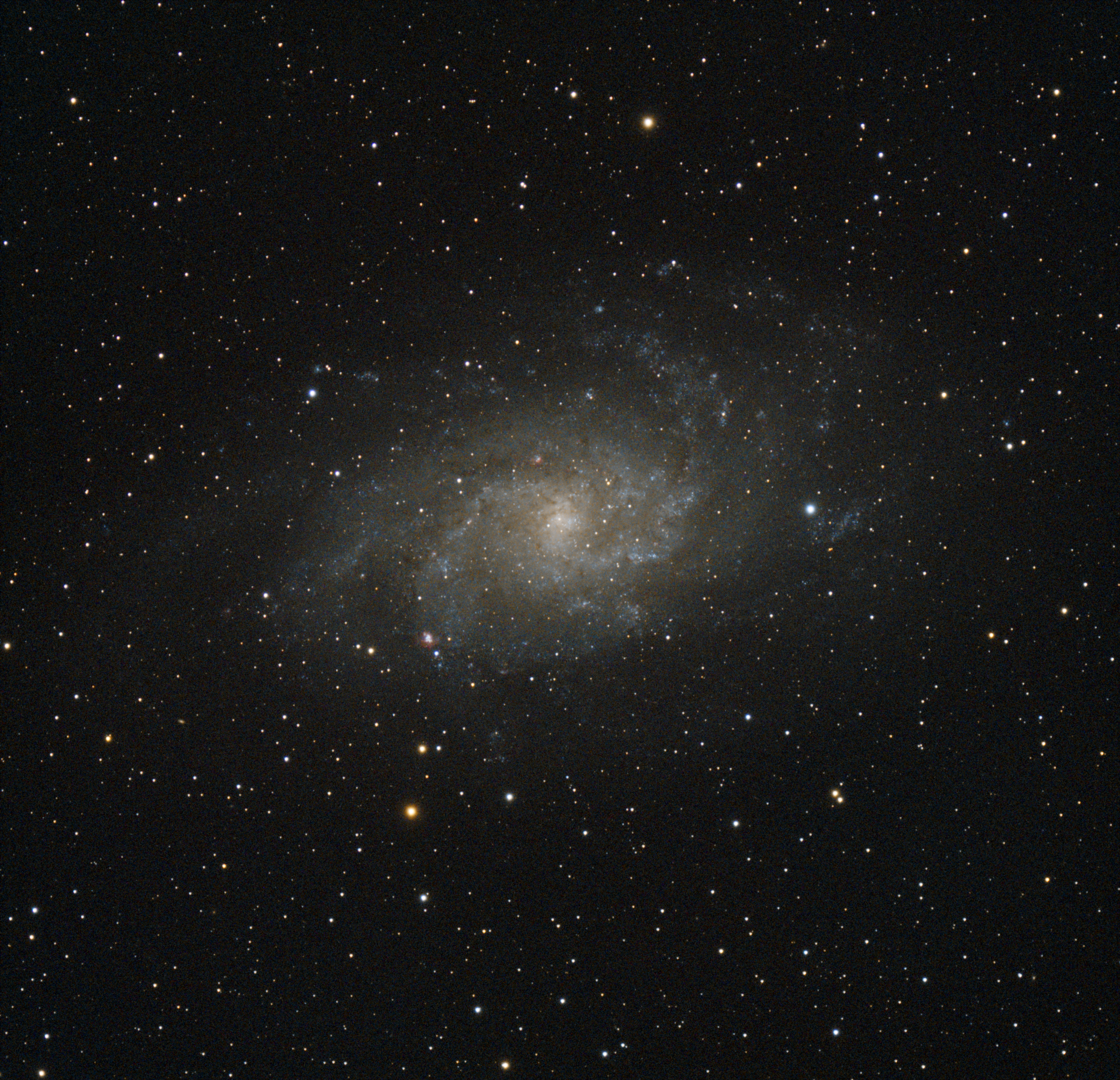 Заново обработал галактику М33 в Треугольнике. Вроде получилось лучше, цвет правильнее, а шума меньше. Применять StarNet не стал. Так натуральнее и звезд больше.