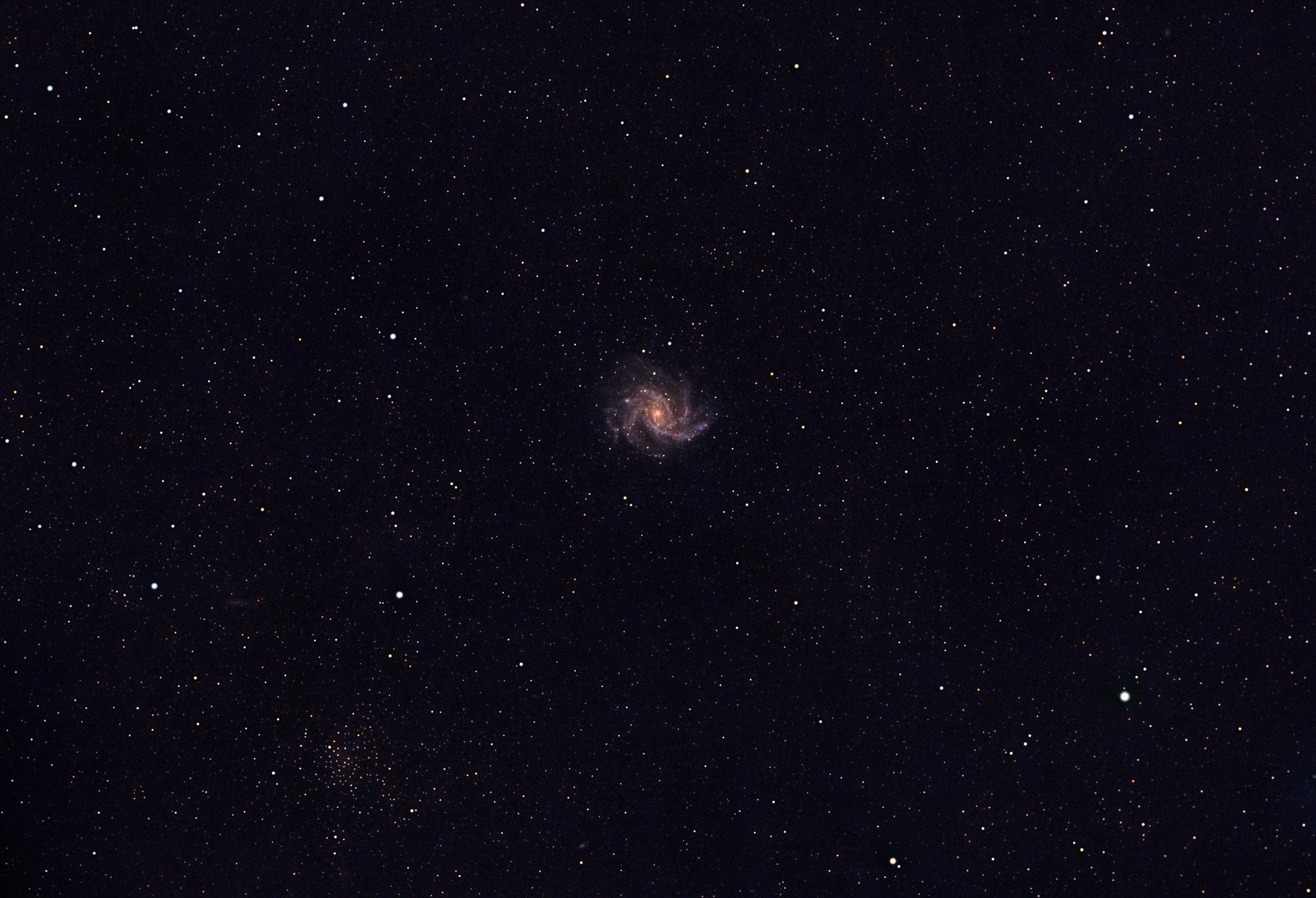 The Fireworks Galaxy (NGC 6946) is located 22 million light-years away and has a diameter of about 40,000 light-years. Its angular size is 11.5' x 9.5'.
