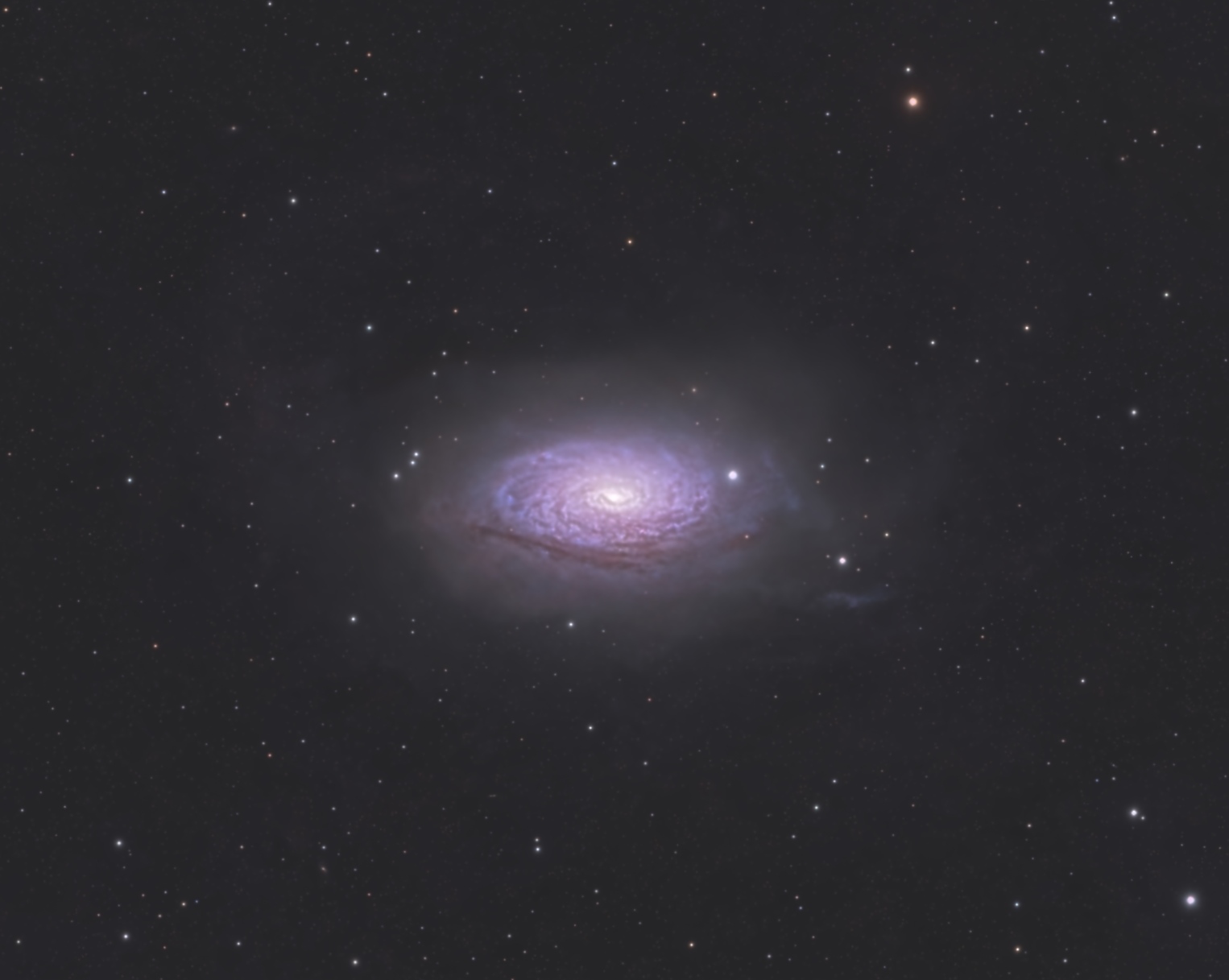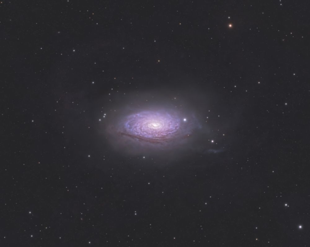 I tried to bring out as much detail as possible around the galaxy (faint arc-shaped stellar streams, which extend nearly 180,000 light-years from the galaxy's center). The stream phenomenon is explained by the merger of galaxy M 63 with another dwarf satellite galaxy. The formation of the stream took about 5 billion years.