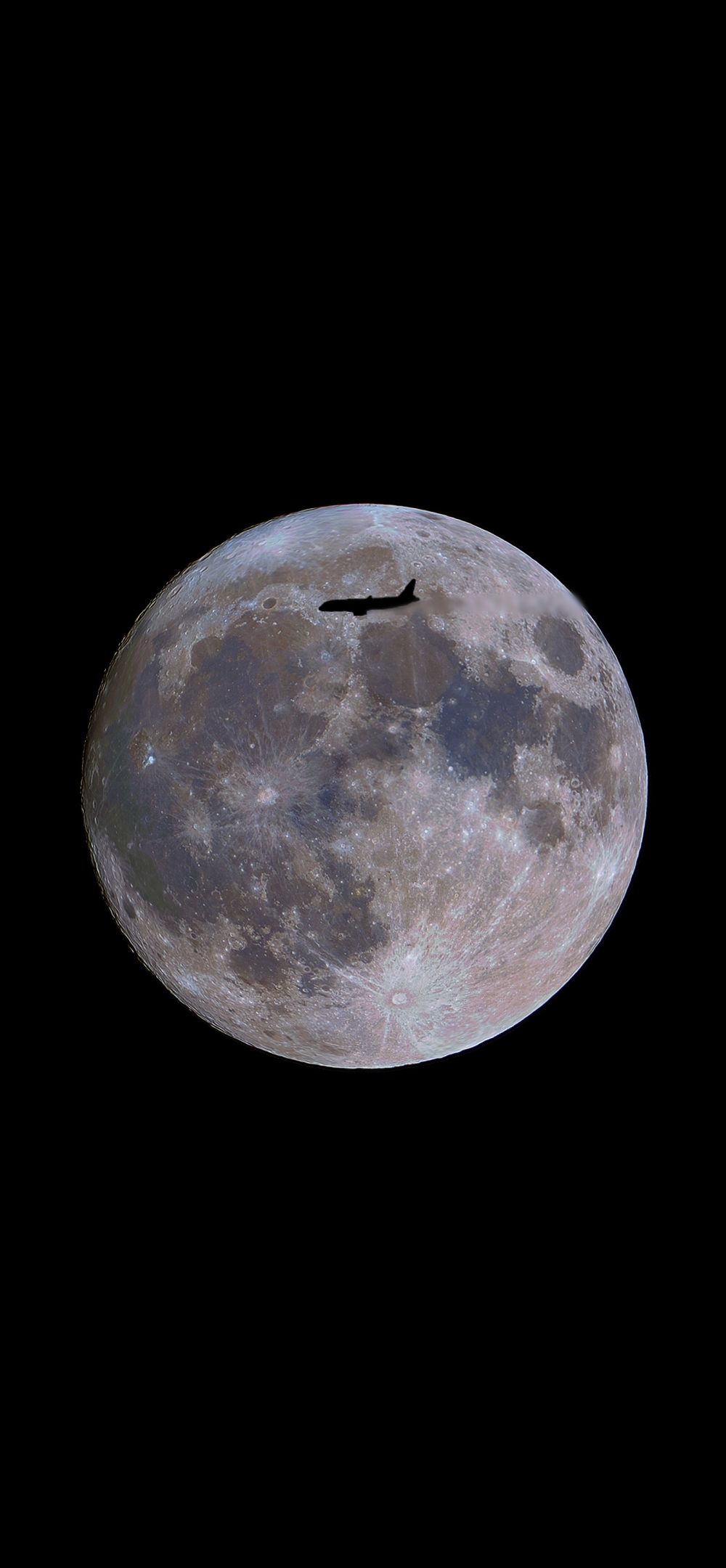 Caught a plane against the upper part of the Moon while landing at Pulkovo. A composite of the Moon from two parts, stacking 100 frames out of 4000 each.
