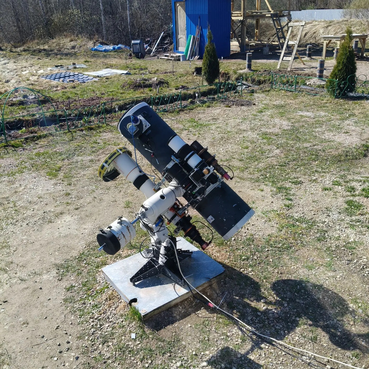 The main collective farm telescopes are now all gathered together in one setup on a single SW Neq6Pro mount. There are five of them: a Newtonian 250/F4.7, an APO120/F5.6, an ED70/F4.8, a Samyang 135/F2, and a 60x240 guide scope. The total weight of the telescopes is 30 kg, plus 22 kg of counterweights. It's a lot. But the mount handles it. This single setup covers the entire range of focal lengths from 1200mm (3600 with a 3x extender) down to 135mm, and a set of fields from 10 degrees diagonally to 40 arcminutes.