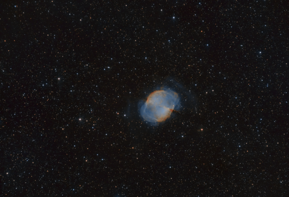 M27 - DUMBBELL NEBULA Telescope/Lens: Sky-Watcher BKP2001 Camera: ZWO ASI294MC Pro Mount: HEQ5 Pro Software: Pixinsight Accessories: Sharpstar 0.95x MPCC Rojdestvenskaya Hava, Russia Light Pollution: Yellow zone Exposure: 67 x 120" ISO/Gain: 121 29 x 300" ISO/Gain: 121 Original size: https://deepskyhosting.com/Vl4drYx Author: Jack_Kup