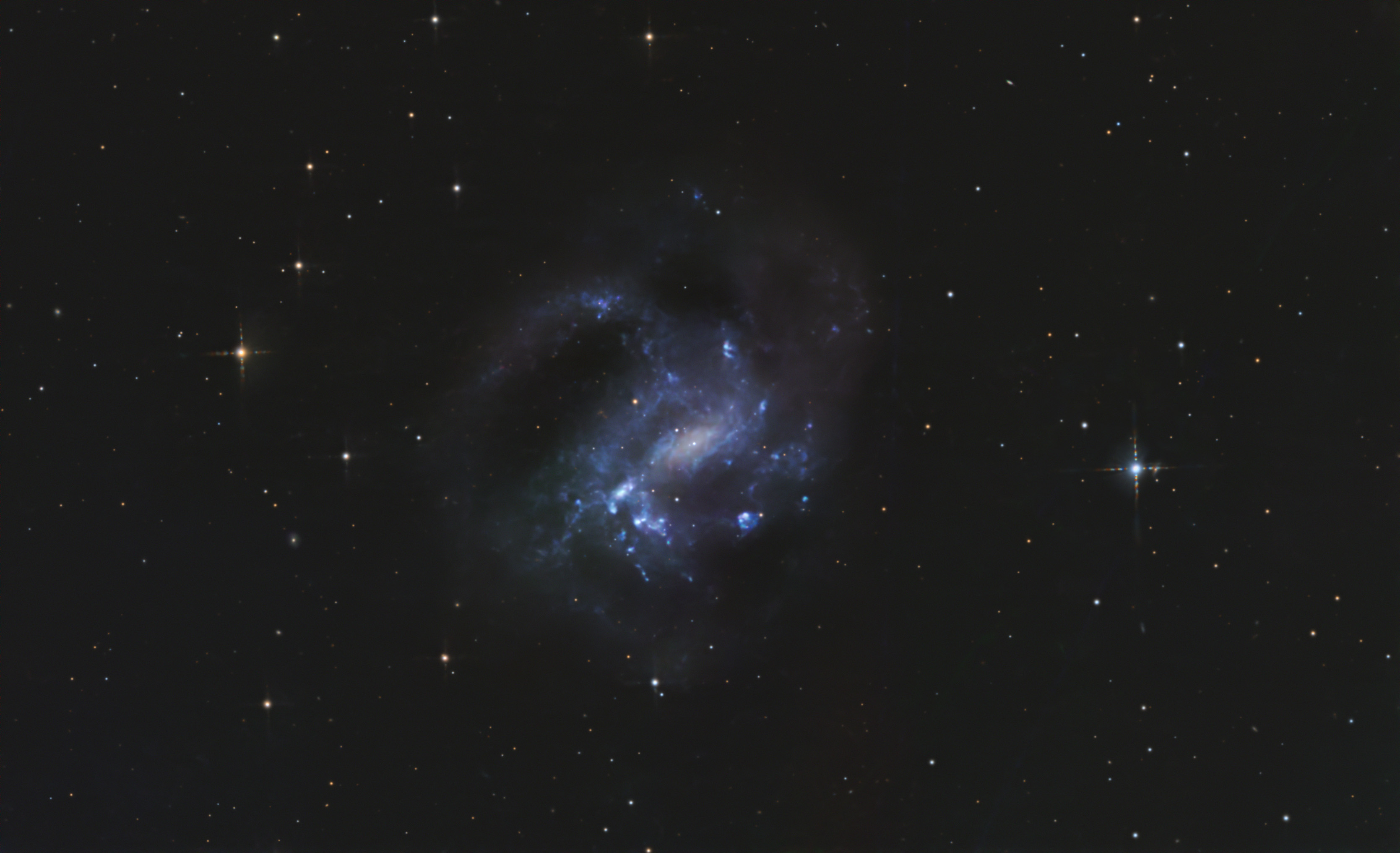 NGC 4395 is a low surface brightness spiral galaxy with a halo about 8′ in diameter. It contains several broad, brighter regions aligned from northwest to southeast, with the brightest one located in the southeast. Three of these regions have their own NGC numbers: 4401, 4400, and 4399, arranged from east to west. The nucleus of NGC 4395 is active, classifying the galaxy as a Seyfert. Notably, it hosts one of the smallest supermassive black holes with a precisely determined mass. The central black hole has a mass of "only" 300,000 solar masses, making it what is called an "intermediate-mass black hole."