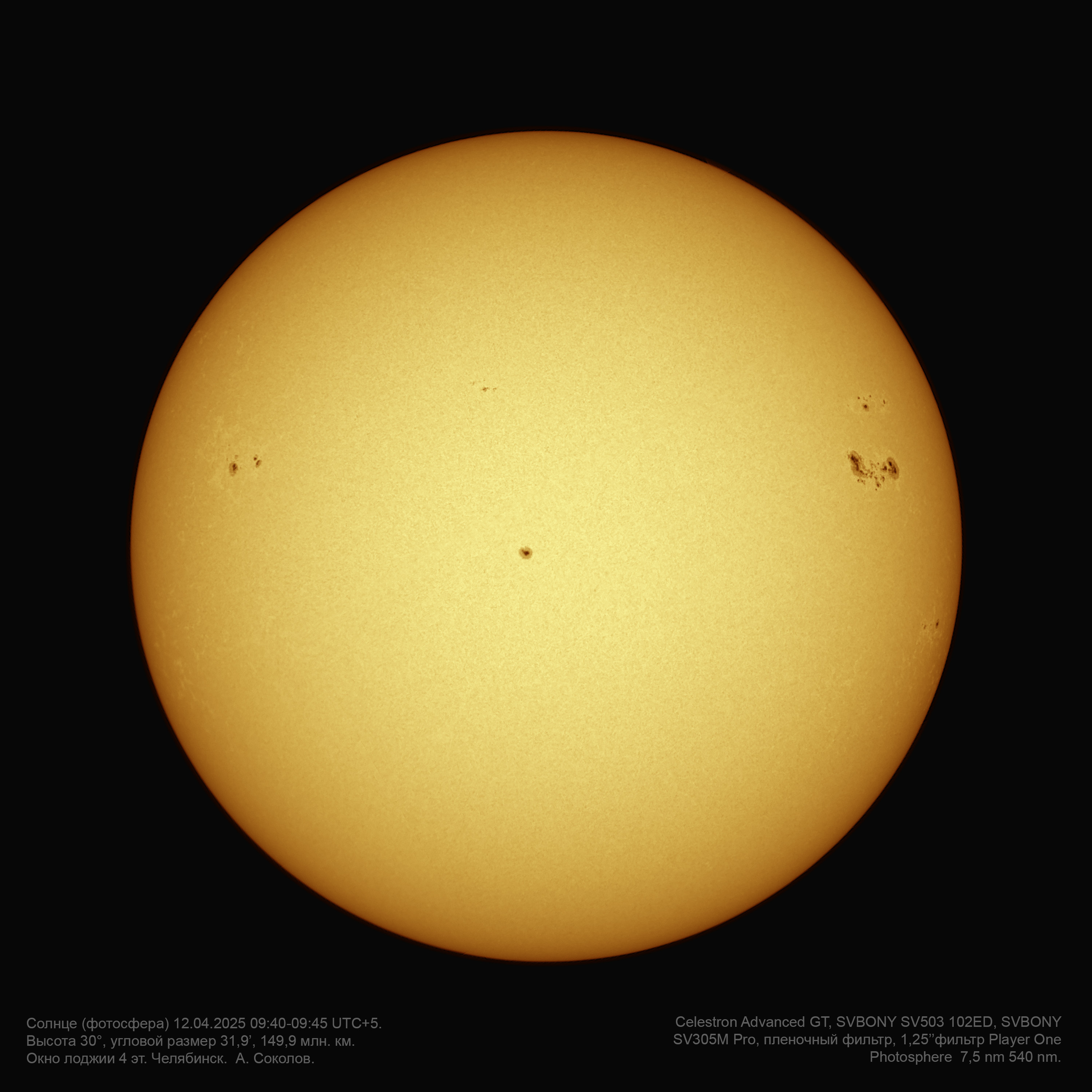 Sun (photosphere) 12.04.2025 09:40-09:45. Altitude 30°, angular size 31.9', distance 149 million km. Loggia window 4th floor. Celestron Advanced GT, SVBONY SV503 102ED, SV305M Pro, film filter, 1.25" Player One Photosphere 7.5 nm 540 nm filter. SharpCap - exp=3 ms, gain=200. AvtoStakkert 50/1000 frames, Photoshop - panorama.