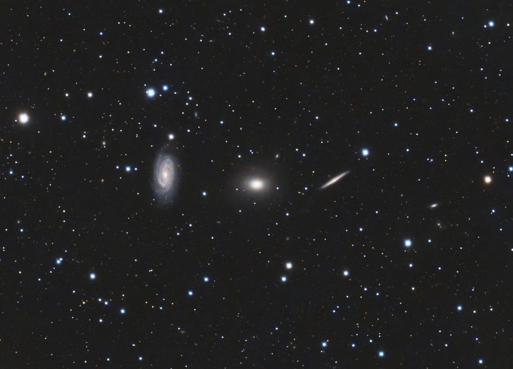NGC 5981 is an edge-on spiral galaxy, distance about 90 million light-years, diameter 70,000 light-years, apparent size 2.7'x0.3'.