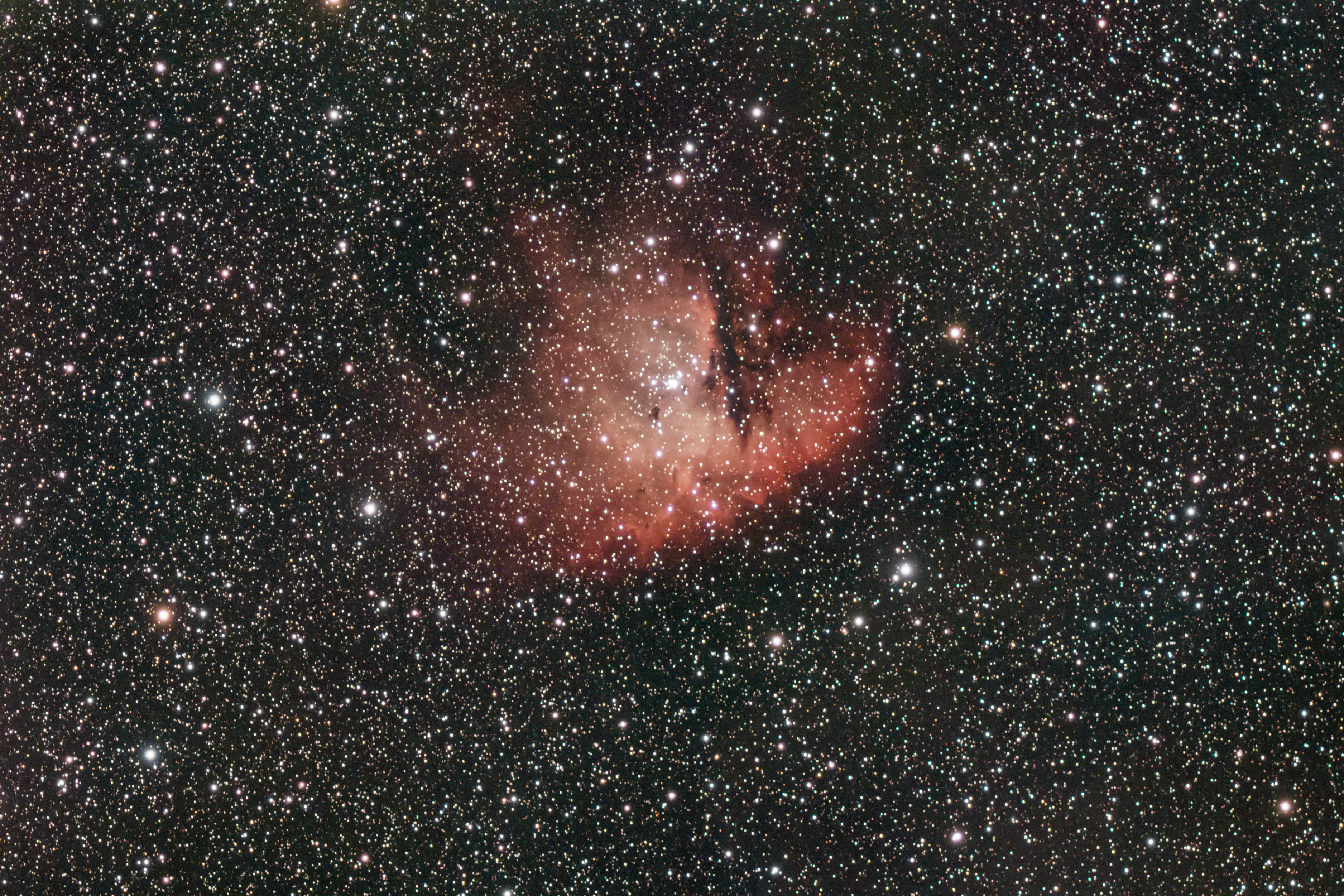 The Pacman Nebula (NGC 281) is a large emission nebula located near the orange giant Schedar in the constellation Cassiopeia. It is located at a distance of approximately 9,200 light-years from us and spans 35 arcminutes of the visible sky. The nebula is also known by other catalog names, such as IC 11 and Sharpless 184 (Sh2-184). The nebula received the name "Pacman" for its resemblance to the character from the popular video game Pac-Man, released in 1980. In optical images, a dark band of dust forms Pacman's mouth. The nebula extends 48 light-years across and is a star-forming region containing young stars, large lanes of dark dust, and Bok globules. Bok globules are small, dense dark nebulae filled with the material from which new stars form. The dark dust lane spreads unevenly across the glowing hydrogen clouds, creating the impression that it is illuminated by a massive background star hidden behind the dark clouds. The study of the Pacman Nebula has been conducted using the NASA/ESA Hubble Space Telescope, which has allowed astronomers to study in detail the young open star cluster IC 1590 located in this star-forming region.