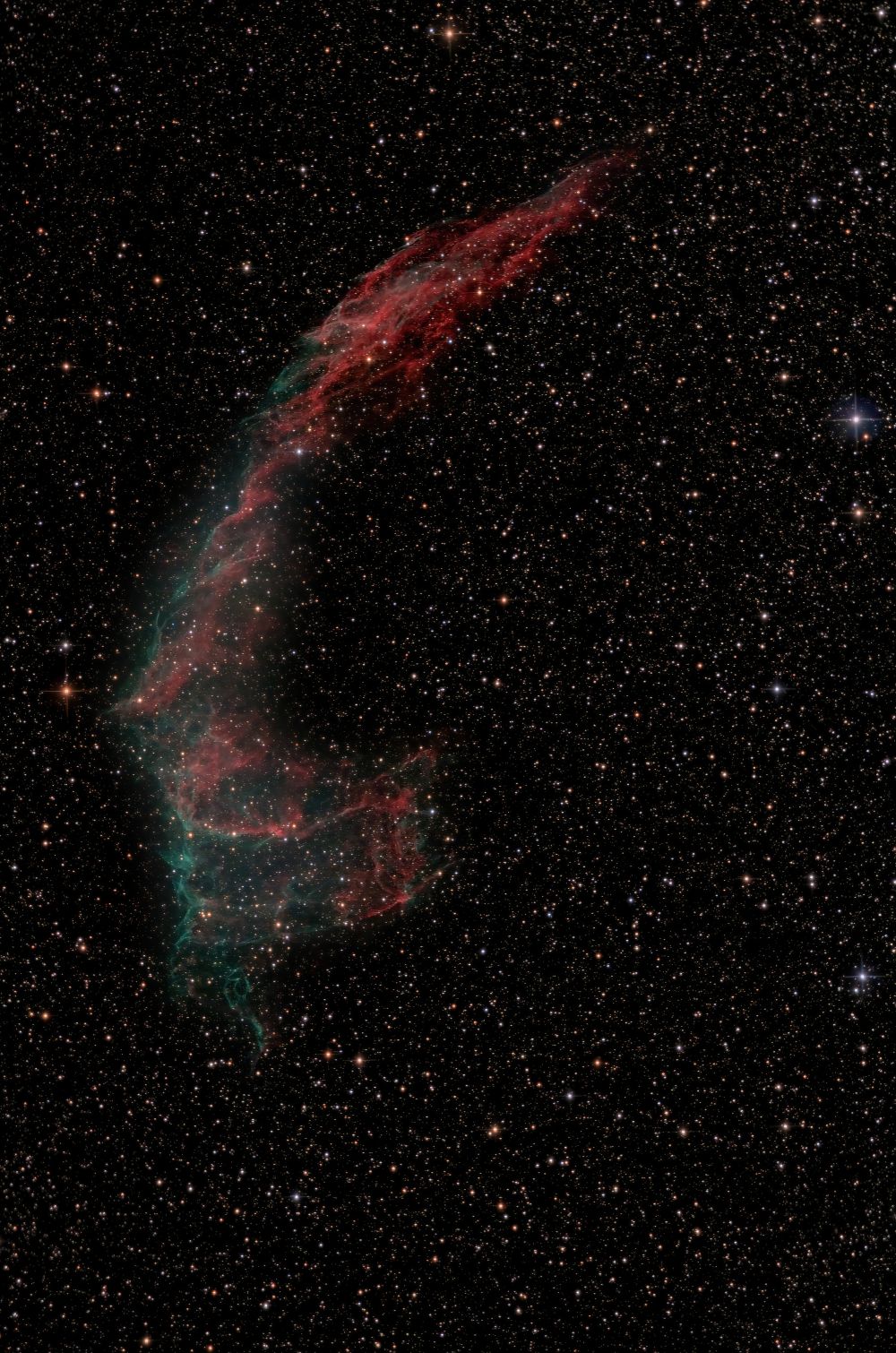 Emission nebula The Net or Eastern Veil (The Western Veil) NGC 6995, CED 182C Supernova remnant in the constellation Cygnus, part of the shock wave Part of the large Veil Nebula. Red color - zones of ionized hydrogen plasma (H II) Bluish color - zones of ionized oxygen plasma (O III)