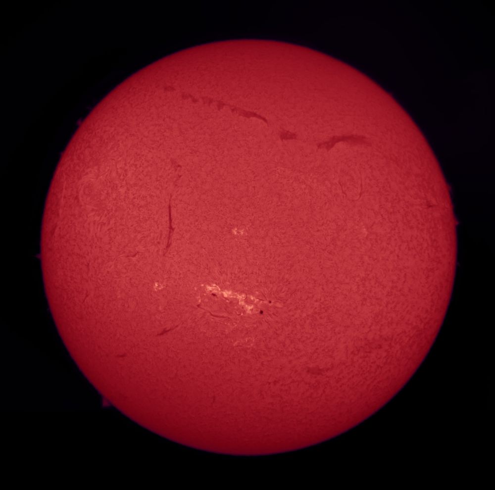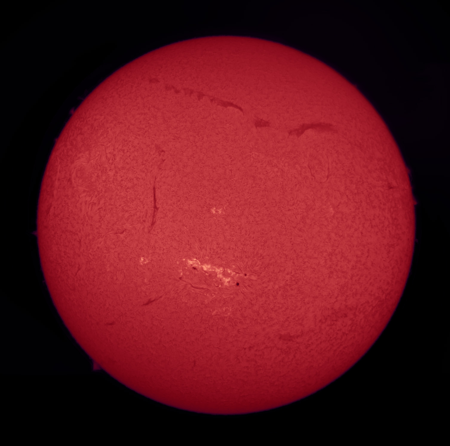 Sun (chromosphere) in H-alpha line - approximately as in Ha-telescope. 08:45-08:48 UTC+5 24.06.2025. Celestron Advanced GT, Lunt 40 mm (LS40THa/B500), Svbony SV305M Pro. Exp=2 ms, gain=50. AutoStakkert - 300 out of 3000 k, Photoshop - mosaic of 2 frames, post-processing.