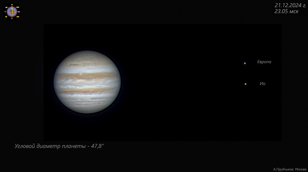 Jupiter, Europa and Io on December 21, 2024. Apolar-125, LB PAG3x, SV705c camera, first light, SV UV/IR filter. Scale 80% of original. Atmospheric stability about 2 points on the Antoniadi scale, brightness about 9 points on the Bortle scale, https://forum.shvedun.ru/viewtopic.php?f=2&t=11298 slight haze, no wind. Southeast Moscow, balcony.