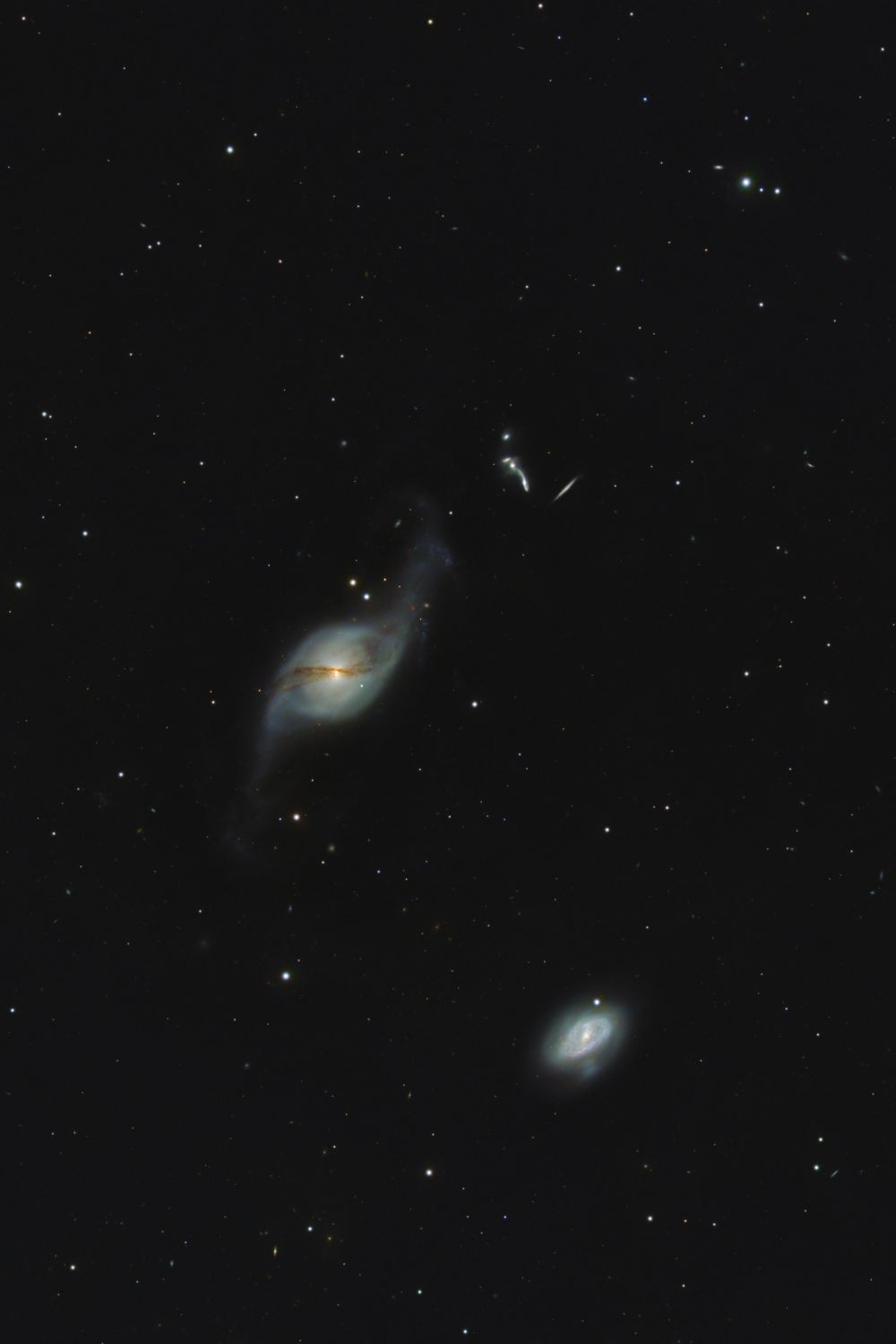 If you look carefully at the area near NGC 3718, you can notice a cluster of elongated smudges. This is Hickson 56—a compact group of 5 galaxies that are much farther away, approximately 400 million light-years from us. They are positioned very close to each other and are likely on a path toward a future merger.