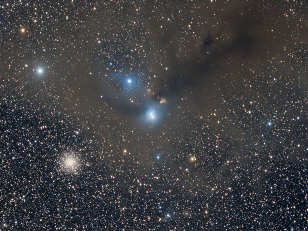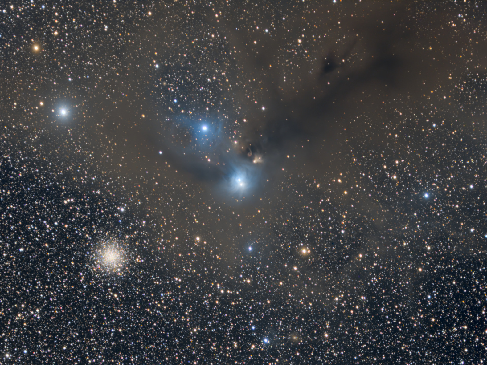 NGC 6727 AND NGC 6723 (THE FOX AND THE KOLOBOK) - A DUST NEBULA AND GLOBULAR CLUSTER IN CORONA AUSTRALIS Light Pollution: Blue zone Exposure: 9 x 300" ISO/Gain: 0 Processing of a 2013 photo. Unfortunately, the shooting parameters could not be recovered. Original size: https://deepskyhosting.com/i5FVEPr Author: Viktor Smagin