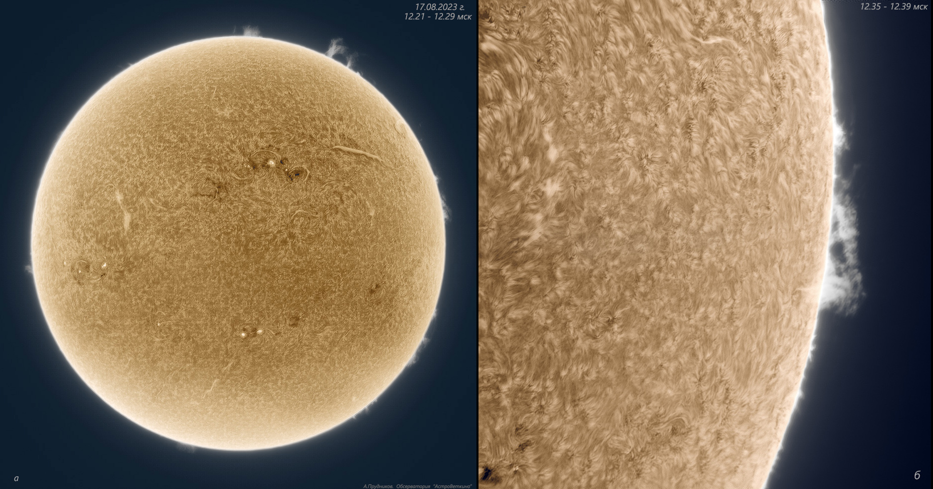 Solar chromosphere in H-alpha line on August 17, 2023. SW-1206-Coronado, (a) - focal reducer, equivalent focal length ~0.5 meters, ZWO ASI 178m camera, UV/IR cut filter, (b) - prominences on the eastern solar limb. Equivalent focal length ~1.3 meters, ZWO ASI 178m camera, UV/IR cut filter, 50% of original size. Atmospheric stability about 3 out of 5 on the scale, variable cloudiness, weak haze. The chromosphere image of the solar disk is inverted and was exposed separately from the prominences.