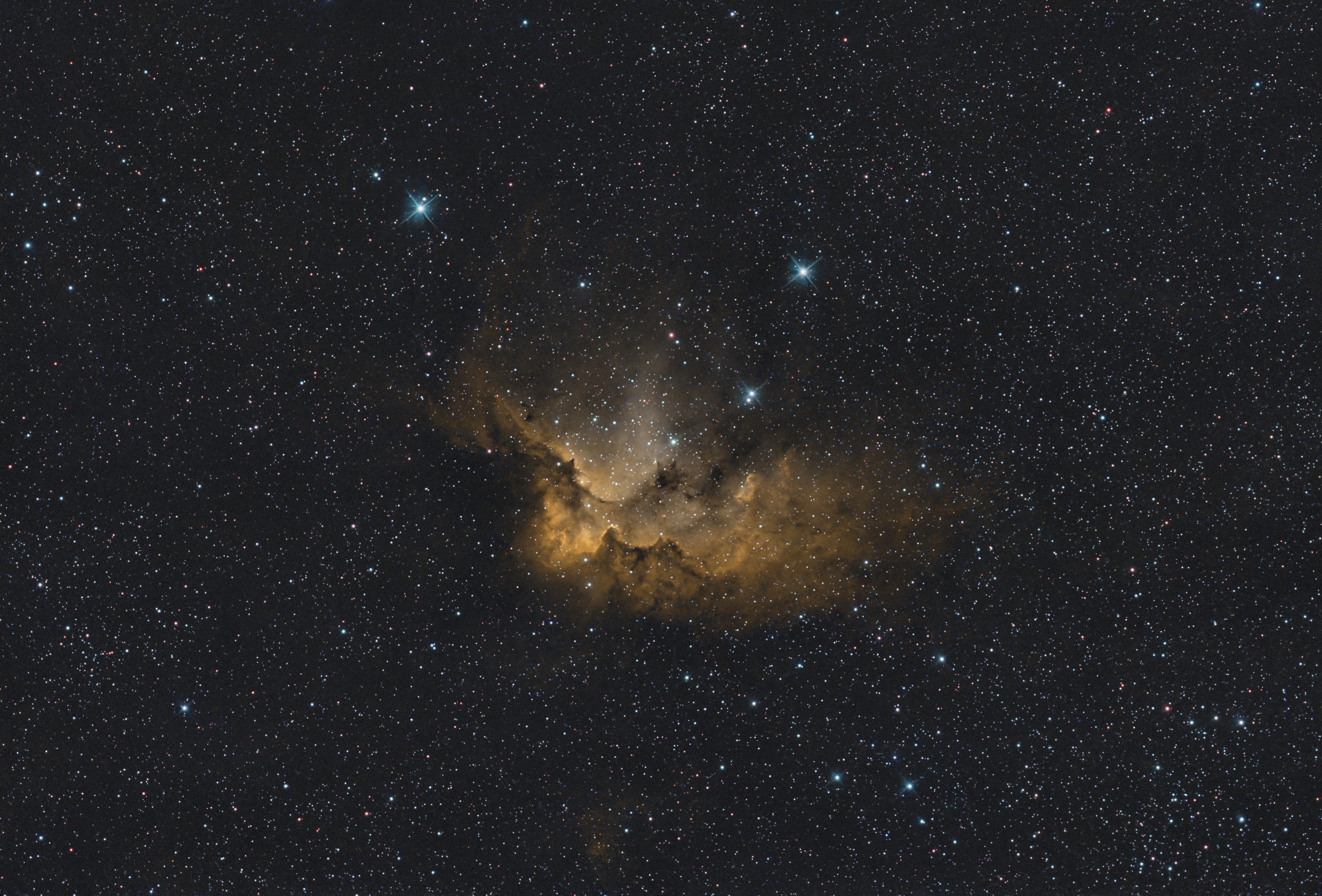 NGC 7380 (also known as OCL 244, LBN 511) is an open star cluster in the constellation Cepheus. It is surrounded by an emission nebula known as the Wizard Nebula. The nebula earned its name because, from certain angles, it resembles a wizard wearing a pointed hat. At the center of the cluster lies DH Cephei—a close binary spectroscopic binary system consisting of two massive O-type stars.