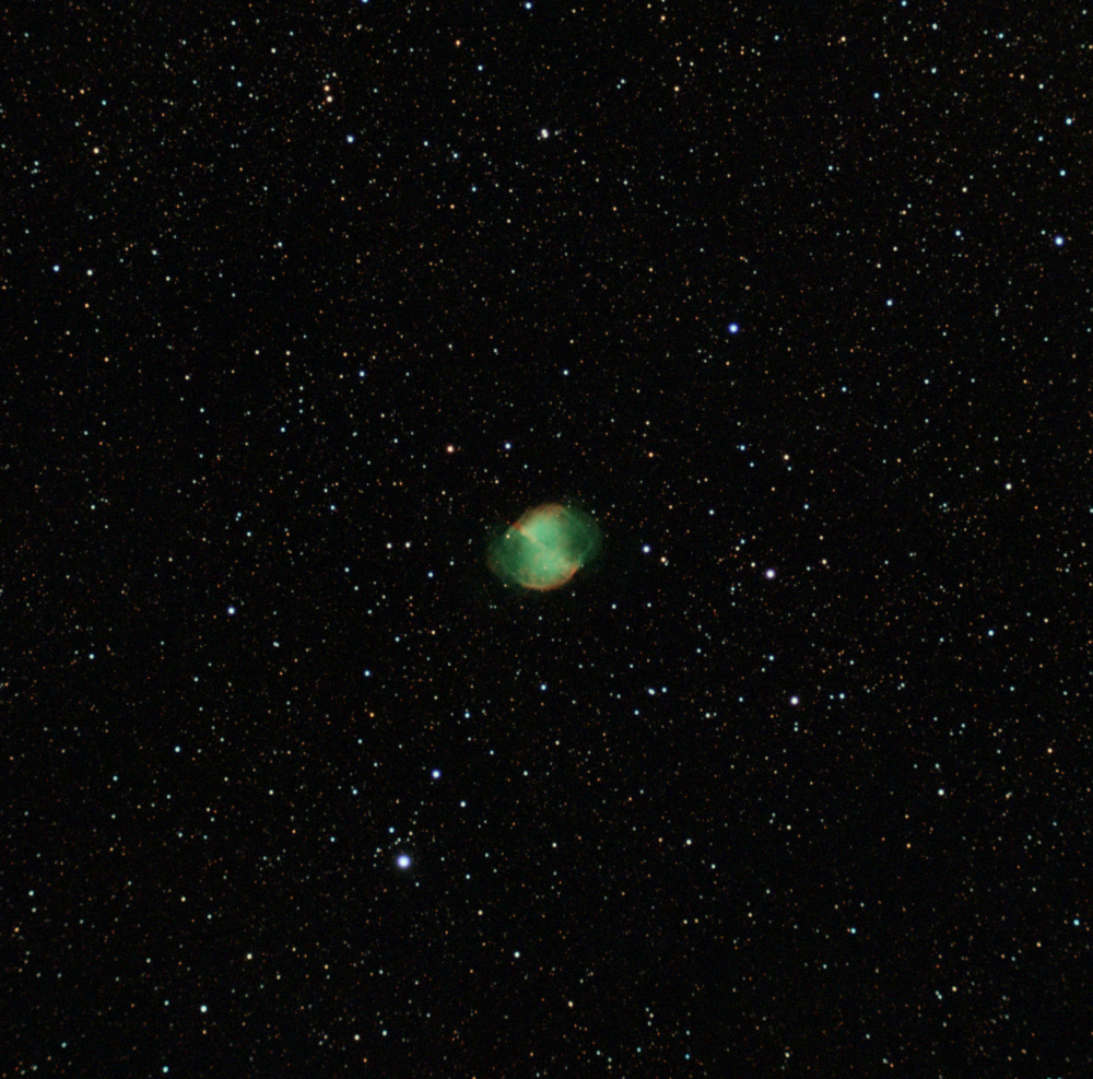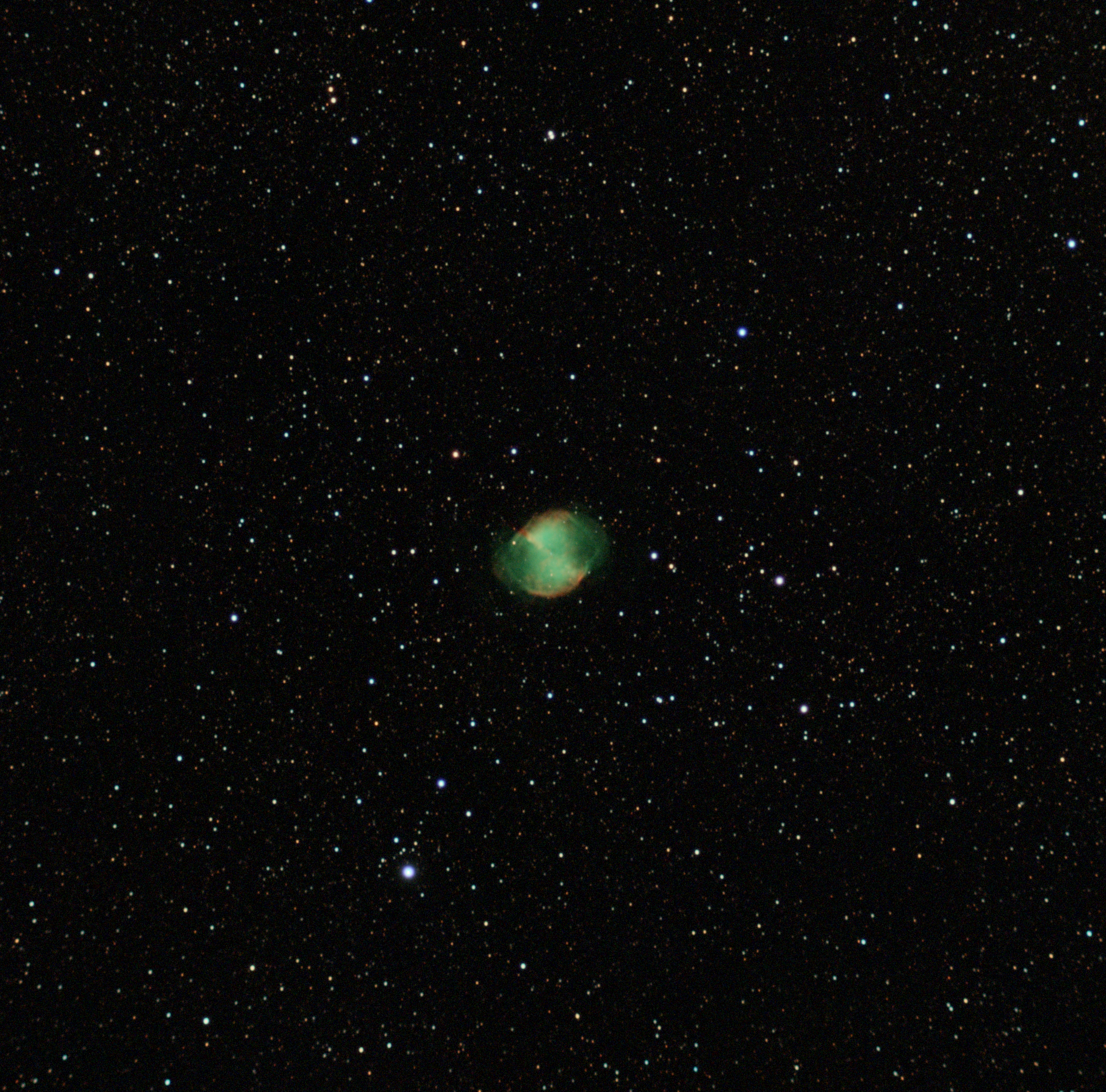 DUMBBELL NEBULA (M27) Telescope/Lens: Levenhuk Ra R72ED 72/432 Camera: Svbony SV605CC Mount: Sky Watcher AZ-GTi Software: N.I.N.A., Siril Accessories: Antlia Triband RGB Ultra Filter II 2" Moskva, Russia Light Pollution: White zone Exposure: 142 x 10" ISO/Gain: 130 Without white balance adjustment Original size: https://deepskyhosting.com/kTR4vNC Author: Maxim Chulkov