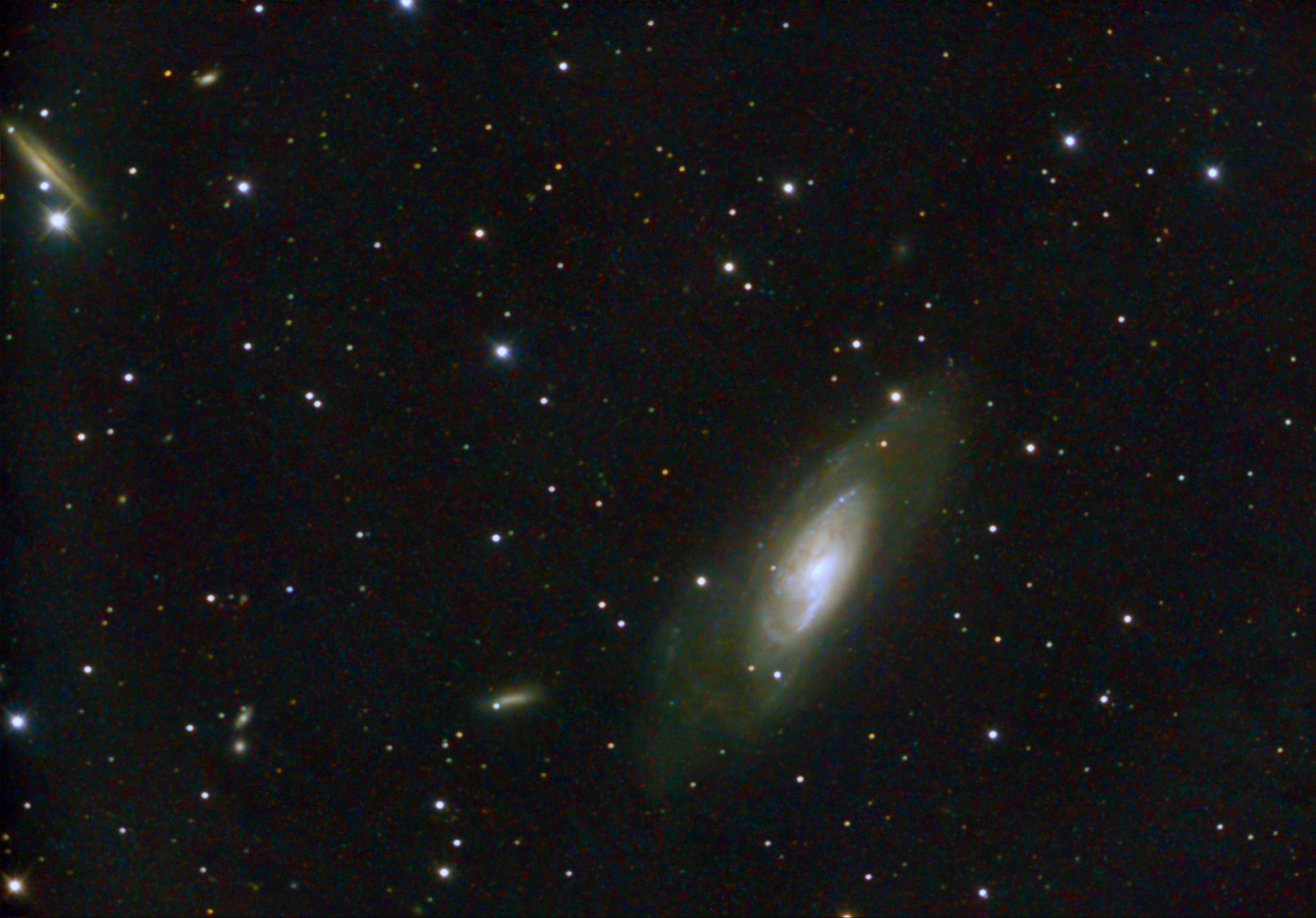 M 106 is a bright Sbp‑type galaxy (due to a possible central bar). Its inclination is similar to that of M 31, making dust lanes clearly visible. The spiral arms end in bright regions—likely areas of recent star formation with hot, massive stars.