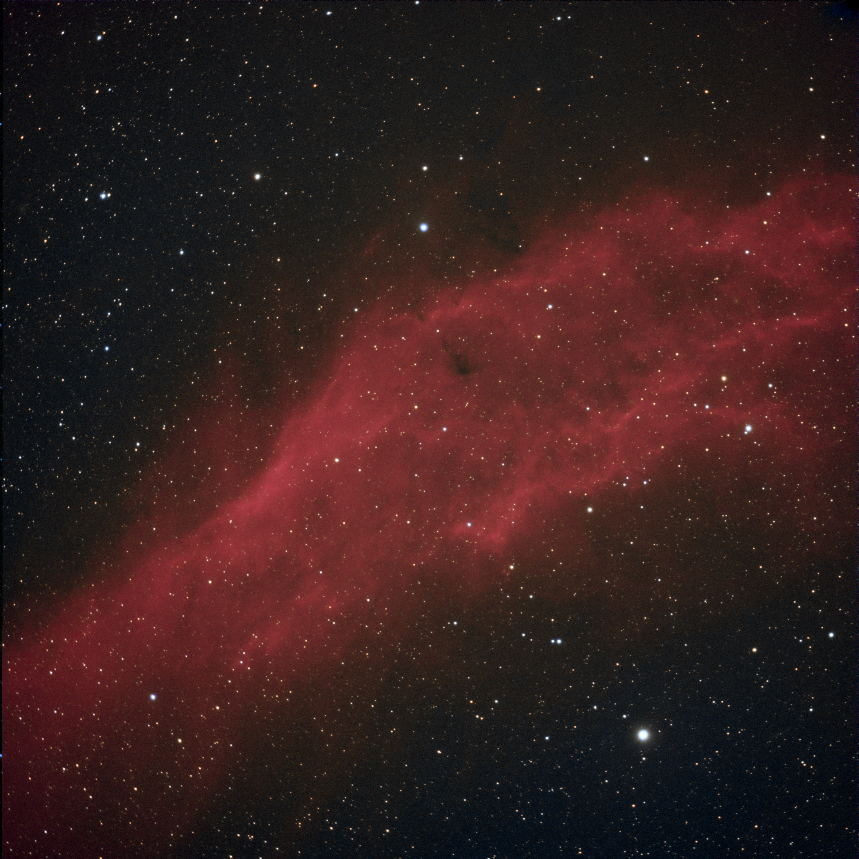 The California Nebula NGC1499 in Perseus, a combination of stacks with UV/IR Cut and SV220 Duoband filters. Equipment: SW66ED+WO0.8III, Celestron Advanced GT mount, Angeleyes 30F4+Datyson T7M guide, Svbony SV605CC camera, Svbony SV220 duoband filter. Exposure: 32x2min, gain=130, offset=50, t=0, Processing: Siril Taken on the night of September 26-27 in Pushchino, Chuvashia (MPC:M12)