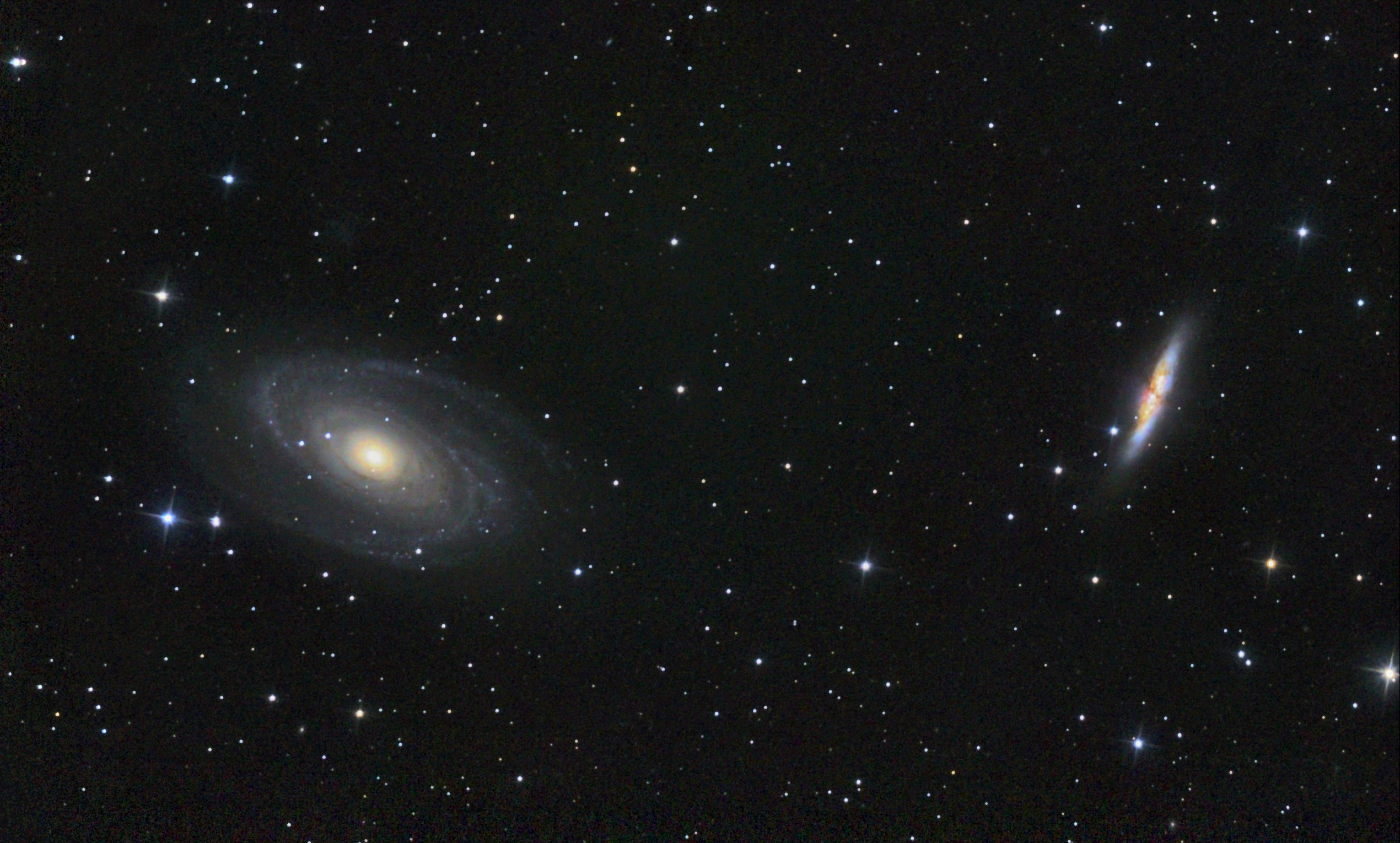 Bode's Galaxy and the Cigar Galaxy are about 12 million light-years from Earth. They are interacting, exerting strong gravitational influence on each other. This interaction has funneled interstellar gas into the center of M82, triggering intense star formation. Like many other galaxies, both M82 and M81 harbor supermassive black holes at their centers. In January 2014, supernova SN 2014J erupted in galaxy M82, which I also observed.