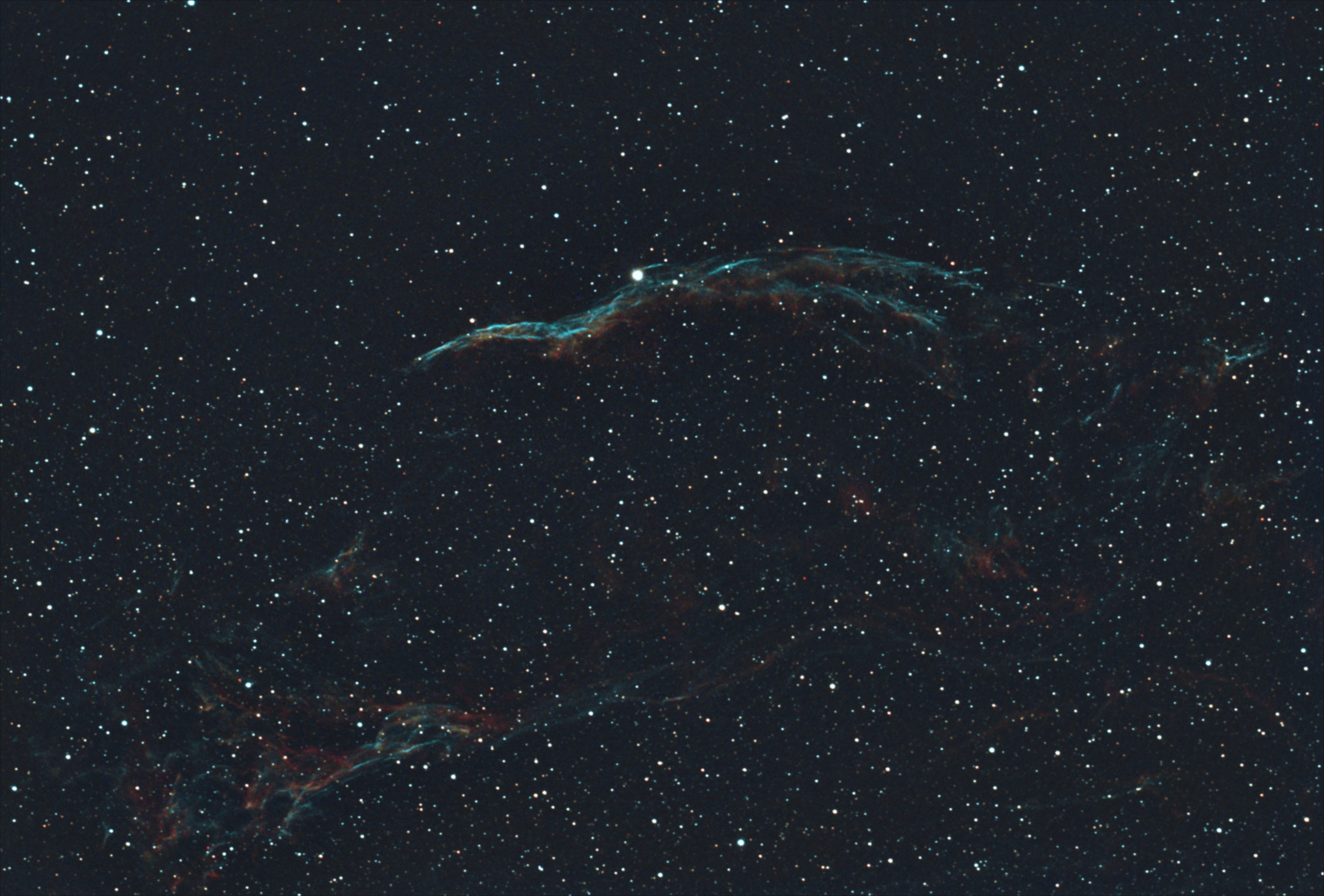 NGC 6960 Witch's Broom and NGC 6979 emission nebulae in the Cygnus Loop. Night of August 2 to 3, 2024. 4th-floor loggia. Light pollution - Bortle 8. Celestron Advanced GT, Svbony SV503 80ED, SV193 0.8x, SV220 7nm Ha OIII, SV405CC. Acquisition: SharpCap - 15x180s. Guiding: SV106 60/240 mm, SV305M Pro - PHD2. DeepSkyStacker, FitsWork, Photoshop.