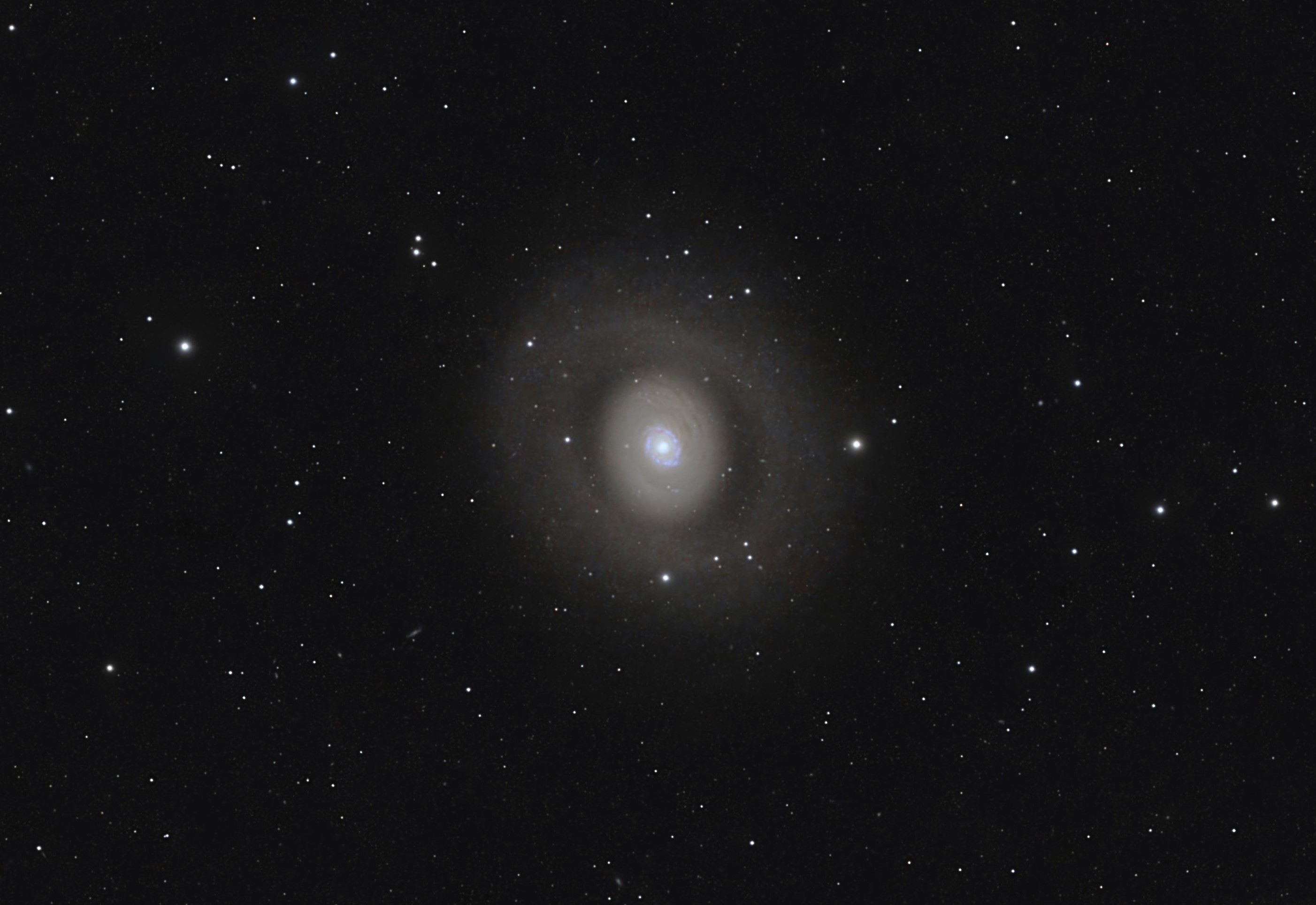 Located in the constellation Canes Venatici. It is 16 million light-years away. The diameter of the main disk is 50,000 light-years. Angular size 14.4'x12.1'. It has two powerful ring-like structures. The inner ring is a site of active star formation, fueled by interstellar gas flowing into the ring from the outer oval bar-like structure. Captured over two days.