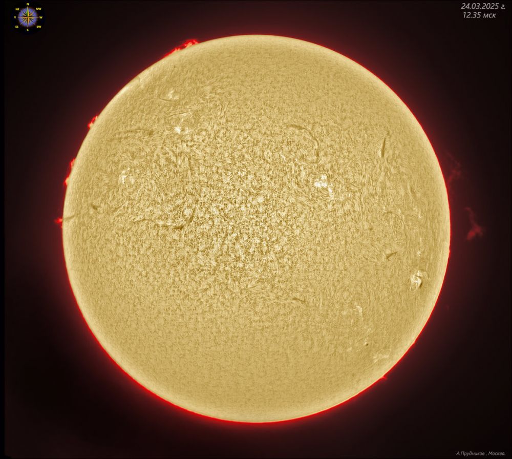 Chromosphere of the Sun on March 24, 2025. DS127-Coronado with a focal reducer, stopped down to 110 mm, equivalent focal length ~0.6 meters. ZWO 178m camera, 50% of the original. Atmospheric stability about 3 points on a five-point scale. Noticeable haze. Southeast Moscow, balcony.