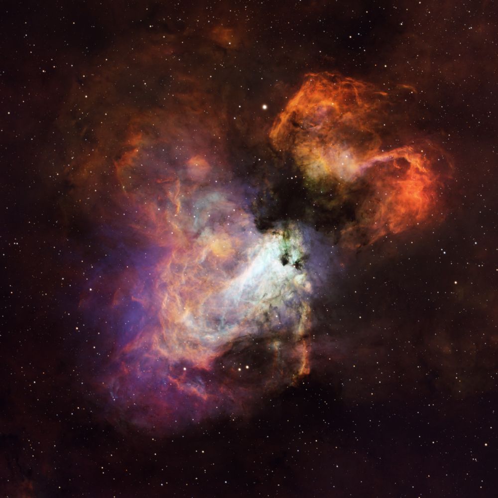 Shot at the end of summer - beginning of autumn 2025. 10 nights because it's in the south, low on the horizon and constant clouds. My own palette based on SHO, calibration, star addition and subtraction in PixInsight, all post-processing in Photoshop, without paid neural network plugins. Denoising and background in GraXpert.