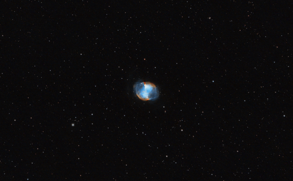 M27 - DUMBBELL NEBULA Telescope/Lens: Deepsky 70/420 ED Camera: ZWO ASI482MC Mount: SW AZ-GTi Software: Siril, StarNet, Photoshop Accessories: Фильтр LAIDA Duoband Moskva, Russia Light Pollution: White zone Exposure: 350 x 10" ISO/Gain: 91 Original size: https://deepskyhosting.com/0DSQhUO Author: Mariya Baeva